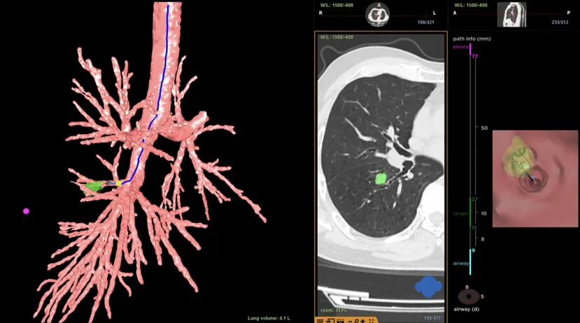 术前,团队进行了充分的准备,用气道内的“GPS”虚拟导航系统(Lung pro)规划出抵达病灶的最优路径。