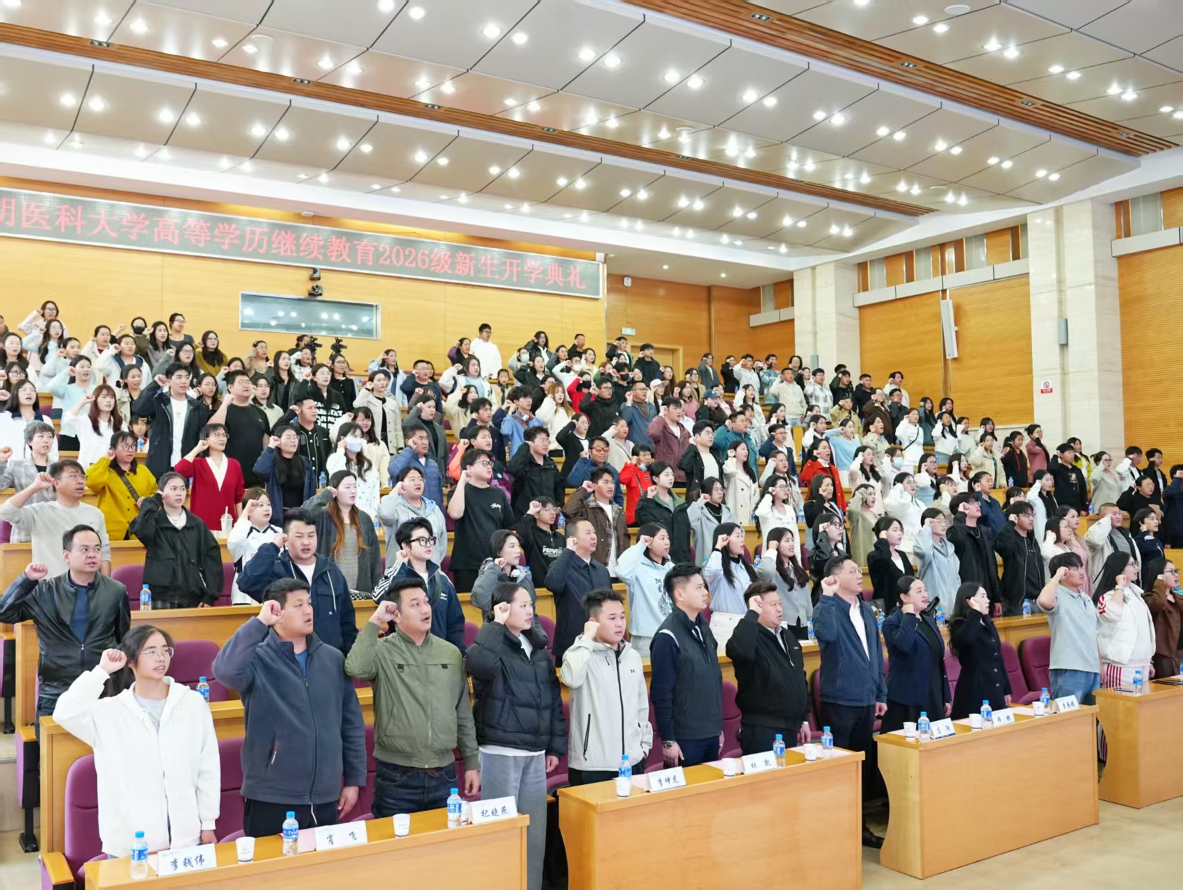 典礼现场举行了庄严的医学生宣誓仪式。在奚春睿的领誓下,全体2026级新生高举右拳、庄严宣誓。铿锵有力的誓言是新生们对医学事业许下的郑重承诺,更彰显了新一届昆医人敬佑生命、救死扶伤、甘于奉献、大爱无疆的坚定信念。