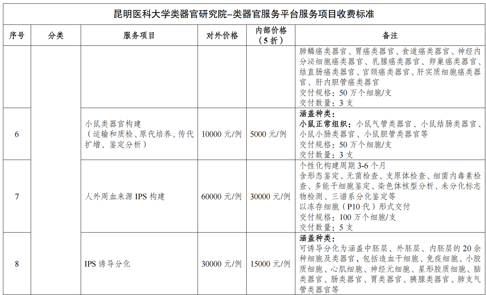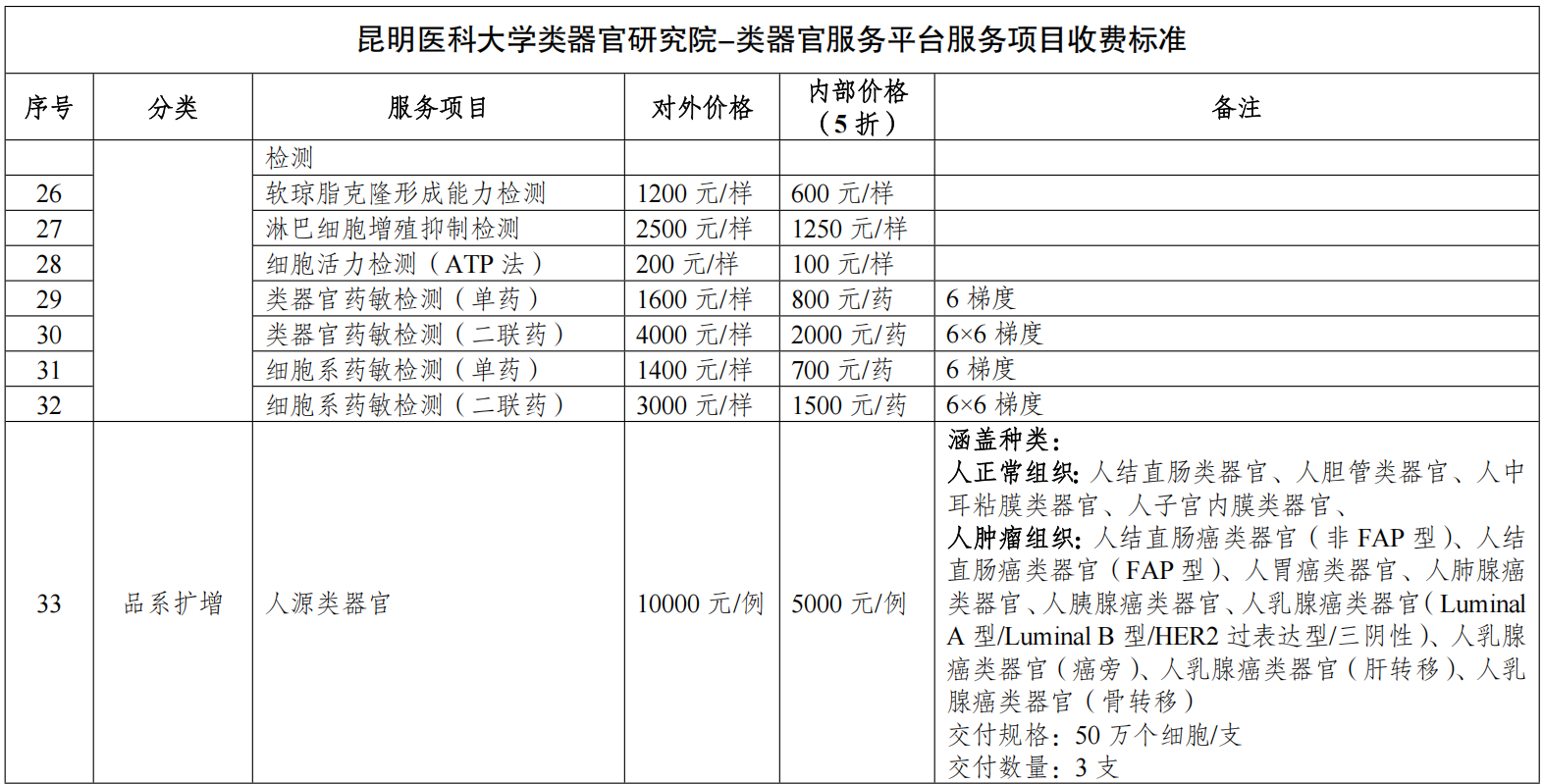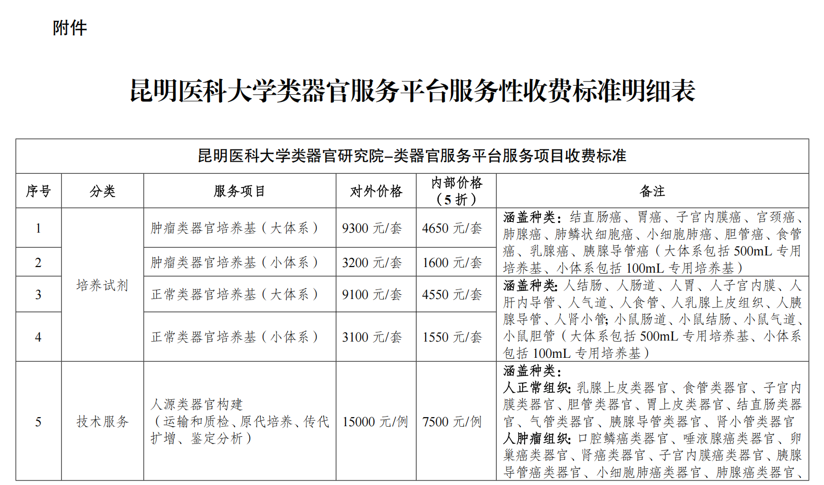 为进一步加强我校服务性收费管理,规范收费行为,按照《云南省教育厅云南省发展和改革委员会关于规范高等学校教育收费备案程序有关事项的通知》要求,学校新增类器官研究院类器官服务平台服务性收费项目,在保证校内师生教学使用的前提下, 按自愿和非盈利原则,对校内人员按使用成本收费,对非本校人员或者单位,按市场价或双方协商收费,报主管部门备案后结合我校实际,制定本管理规定。