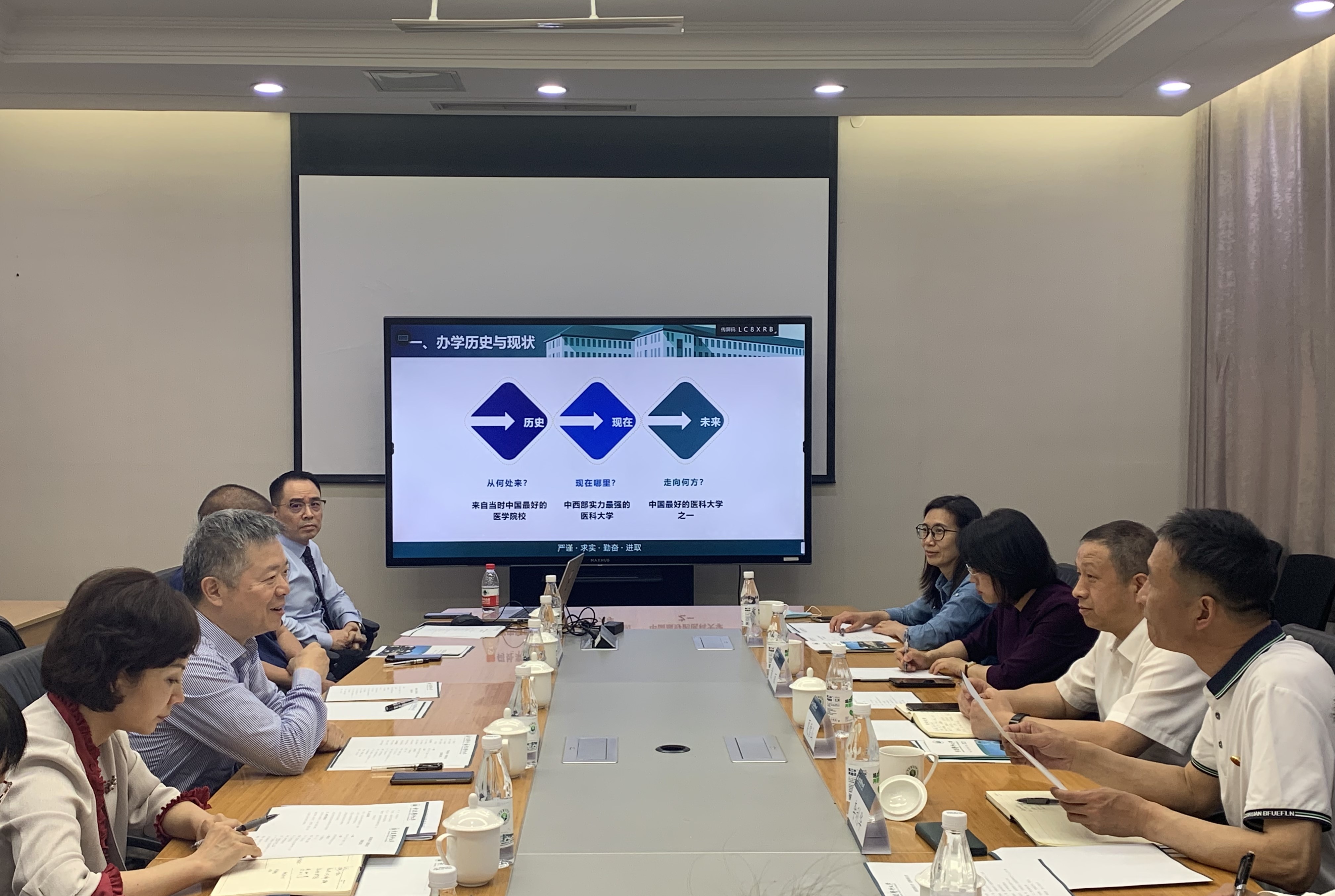 邓世雄主持座谈会,对伟德国际1949官网一行到来表示欢迎,并介绍了重庆医科大学的办学历程、学位点与专业建设、人才培养、师资队伍、科学研究、内部治理等方面的基本情况。