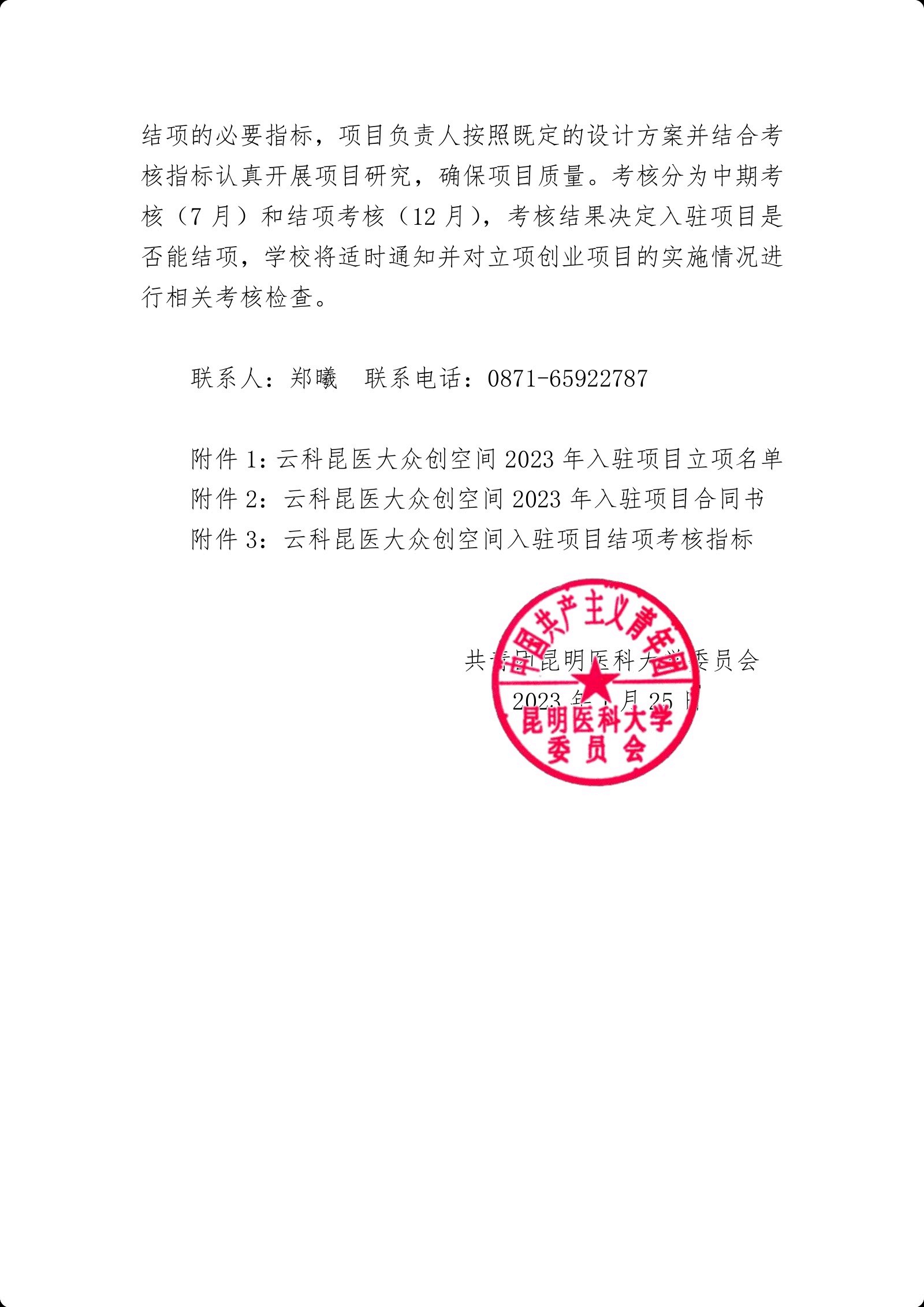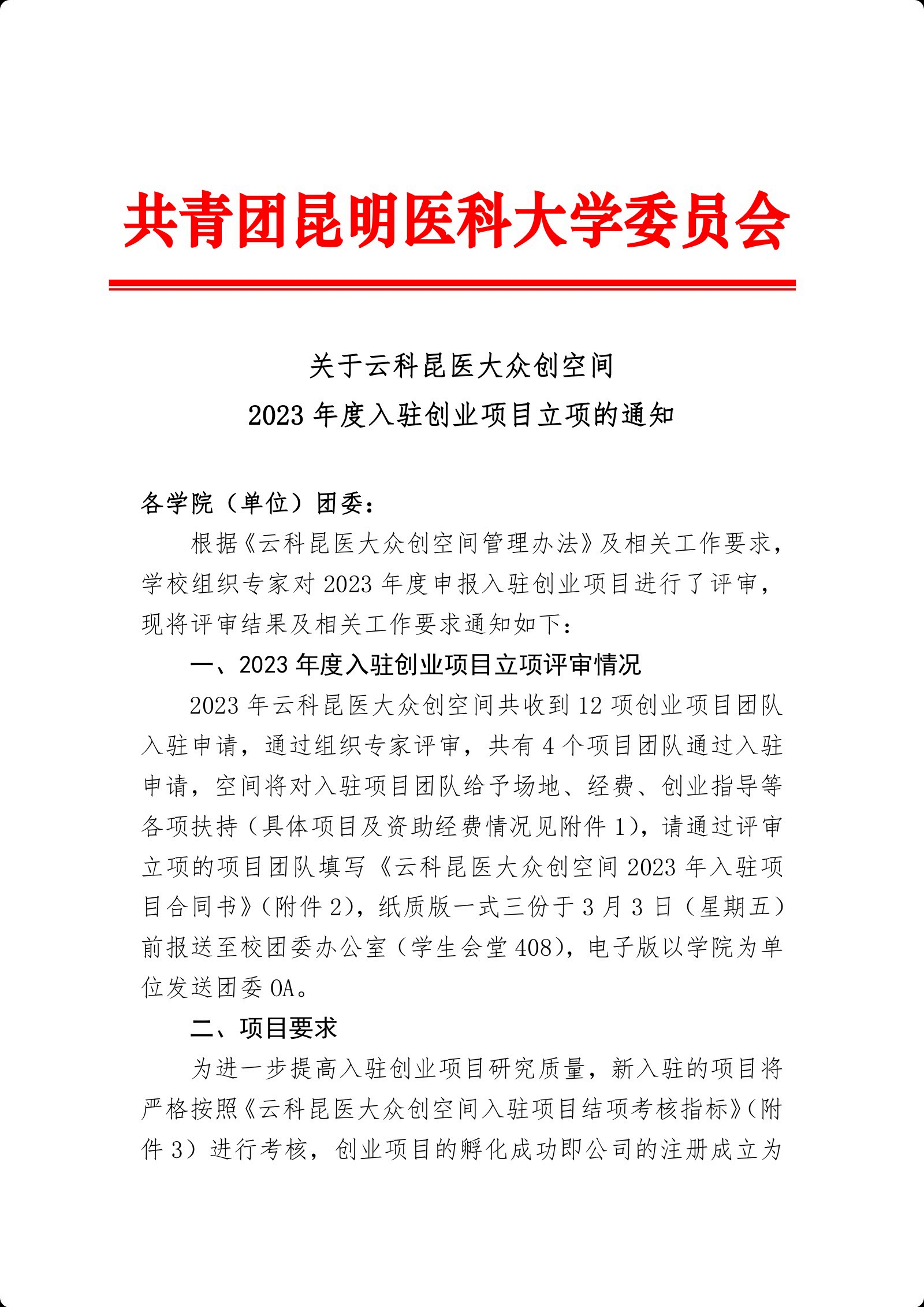 关于云科昆医大众创空间 2023 年度入驻创业项目立项的通知