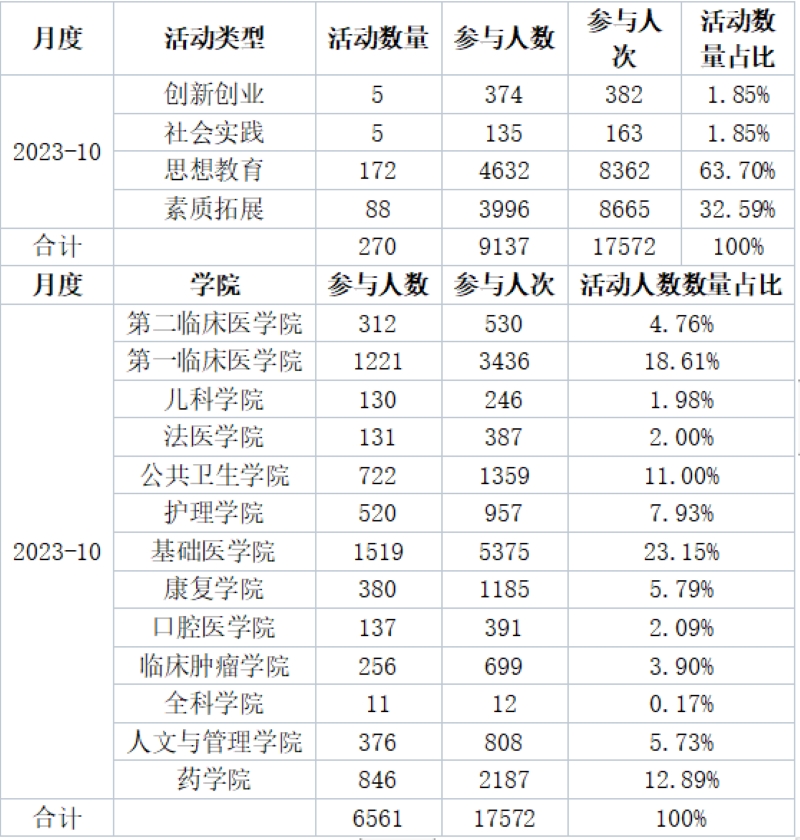 截止2023年10月31日,“第二课堂”平台共开展活动270项,参与人数9137人,参与人次17572次。