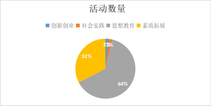 活动类型包括创新创业、社会实践、思想教育、素质拓展。创新创业类活动开展5项,社会实践类活动开展5项,思想教育类活动开展172项,素质拓展类活动开展88项。