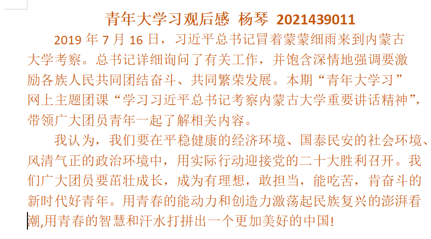 创新开展青年大学习。支部在每周一利用“接龙管家”小程序发送学习任务,周中查看学习情况并进行提醒,每周五课间休息时组织1名同学进行观后感分享,团支部书记定期组织同学们对青年大学习的“课后习题”进行提问,温故而知新,以此来夯实同学们的理论知识。该方法充分调动了每一名支部团员的积极主动性,支部学习完成率为100%。