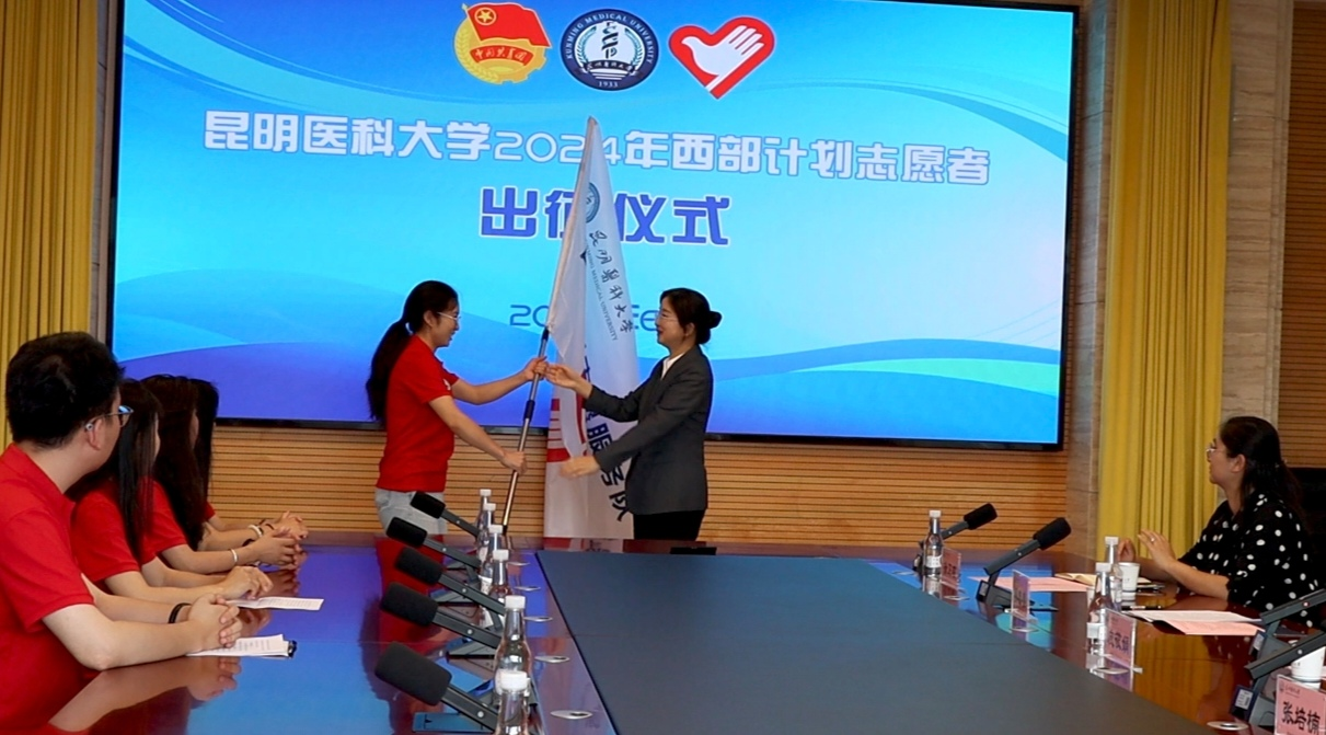 校领导为2024年西部计划志愿服务团和伟德国际1949官网第三届研支团授旗,为20名西部计划志愿者和6名研究生支教团成员颁发绶带。