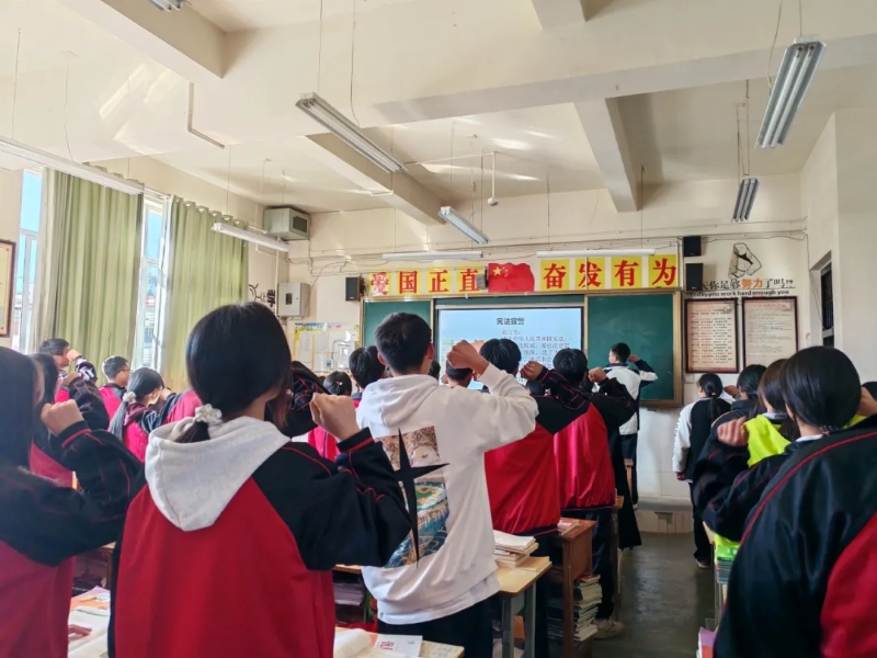 宪法宣传周期间,研支团成员王强作为班主任,组织了一场以宪法知识为主题的班会活动。通过生动的案例和深入浅出的讲解,激发了学生们学习宪法的兴趣和热情。班会最后,研支团成员王强带领全班学生共同宣誓,承诺将始终坚守宪法原则,积极践行法治精神,为构建和谐社会、法治校园贡献自己的力量。宣誓声在教室里回荡,展现了学生们对宪法的坚定信仰和崇高追求。
