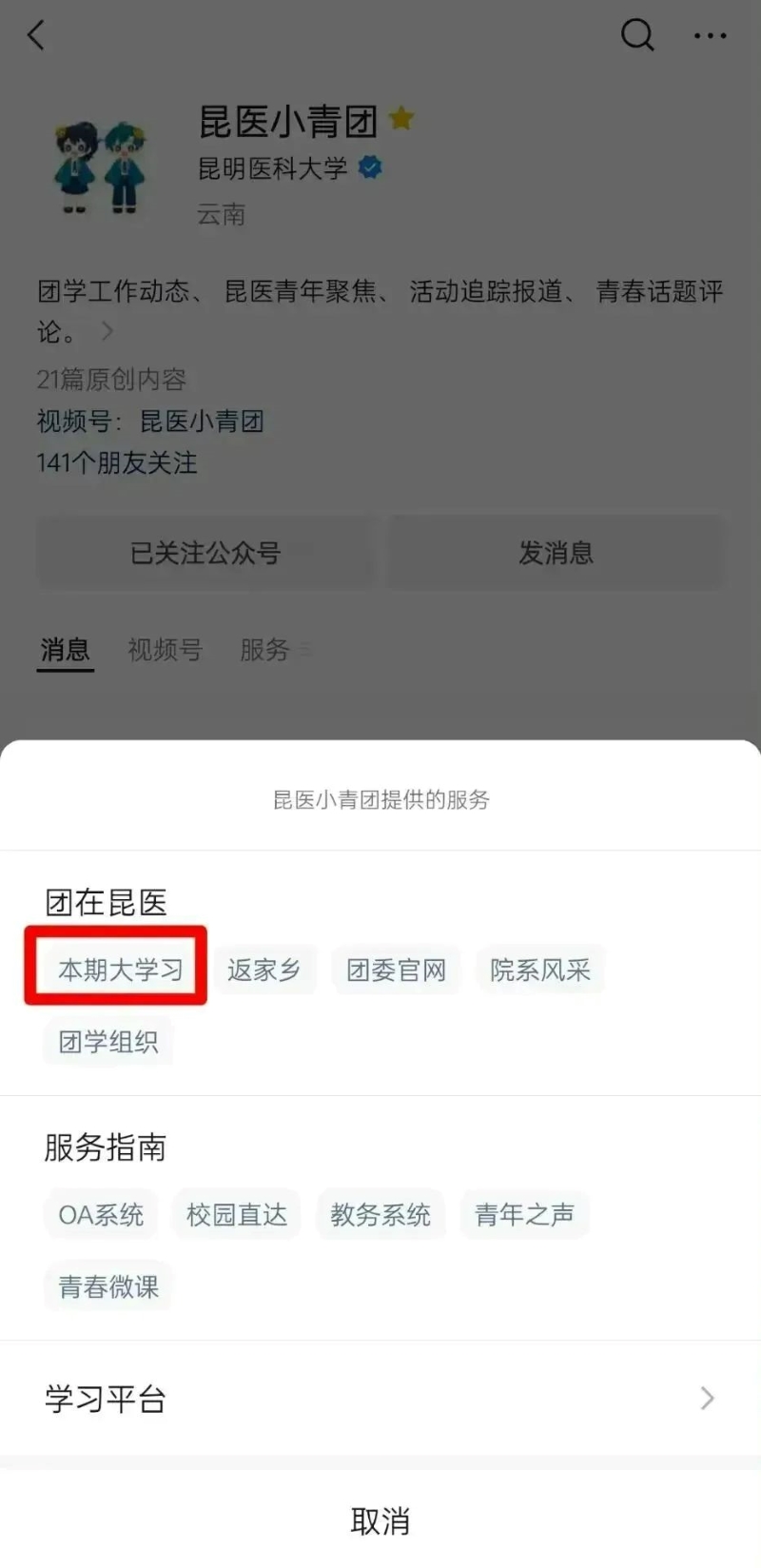 关注“云南共青团”微信公众号,点击“大学习”菜单栏参与学习。