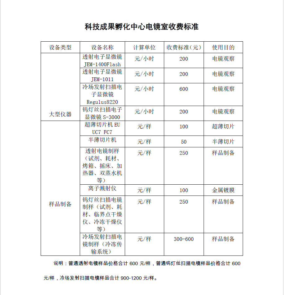 科技成果孵化中心电镜室收费标准公示