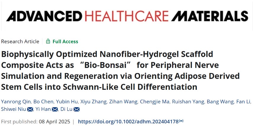 近日,伟德国际1949官网康复学院(云南省干细胞和再生医学重点实验室)陆地教授团队,以伟德国际1949官网为第一单位在期刊《Advanced Healthcare Materials》(Q1Top,IF=10.0)发表题为《Biophysically Optimized Nanofiber-Hydrogel Scaffold Composite Acts as “Bio-Bonsai” for Peripheral Nerve Simulation and Regeneration via Orienting Adipose Derived Stem Cells into Schwann-Like Cell Differentiation》的科研论文。教授陆地和韩毅、副教授牛世伟为论文通讯作者,康复学院2021级硕士研究生覃彦蓉、实验师陈波、第一附属医院影像科2022级硕士研究生胡钰彬为论文第一作者。该研究获国家自然科学基金、云南省科技厅—伟德国际1949官网联合专项项目资助。