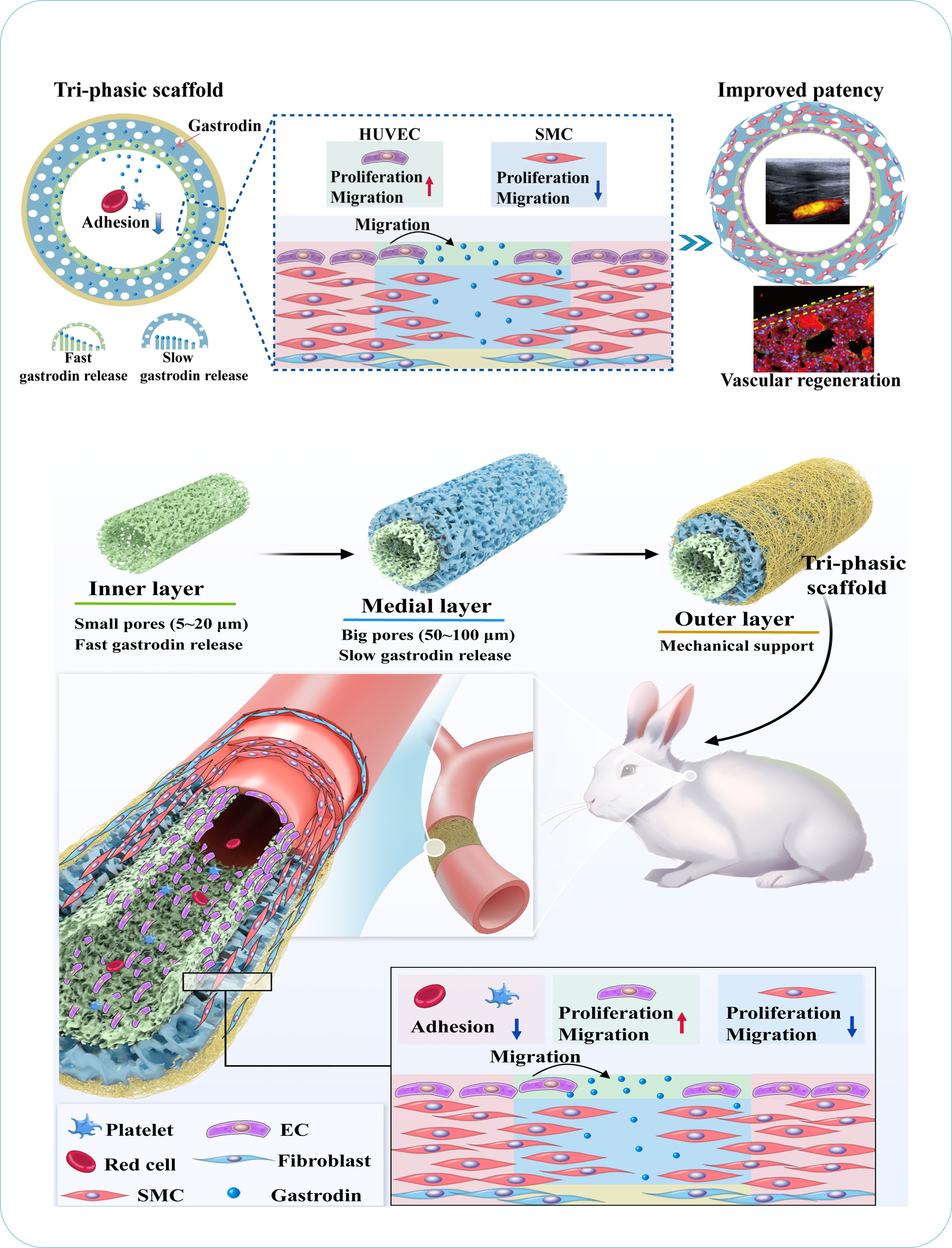 研究表明,内层的小孔隙诱导人脐静脉内皮细胞 (HUVECs) 浸润,中层的大孔隙为平滑肌细胞 (SMCs) 提供了良好的空间结构;且天麻素的分级释放介导了HUVECs 和 SMCs 中关键蛋白的空间分布和差异调节,其中天麻素在内层的快速释放通过激活 eNOS 和 HSP70 信号促进 HUVECs 的增殖和迁移,一定程度上抑制了 SMCs 的过度增殖。体内实验进一步证实了血管的分级再生并保持了较高的通畅率,表明分级释放系统不仅抑制了内膜增厚,而且严格调控组织再生。