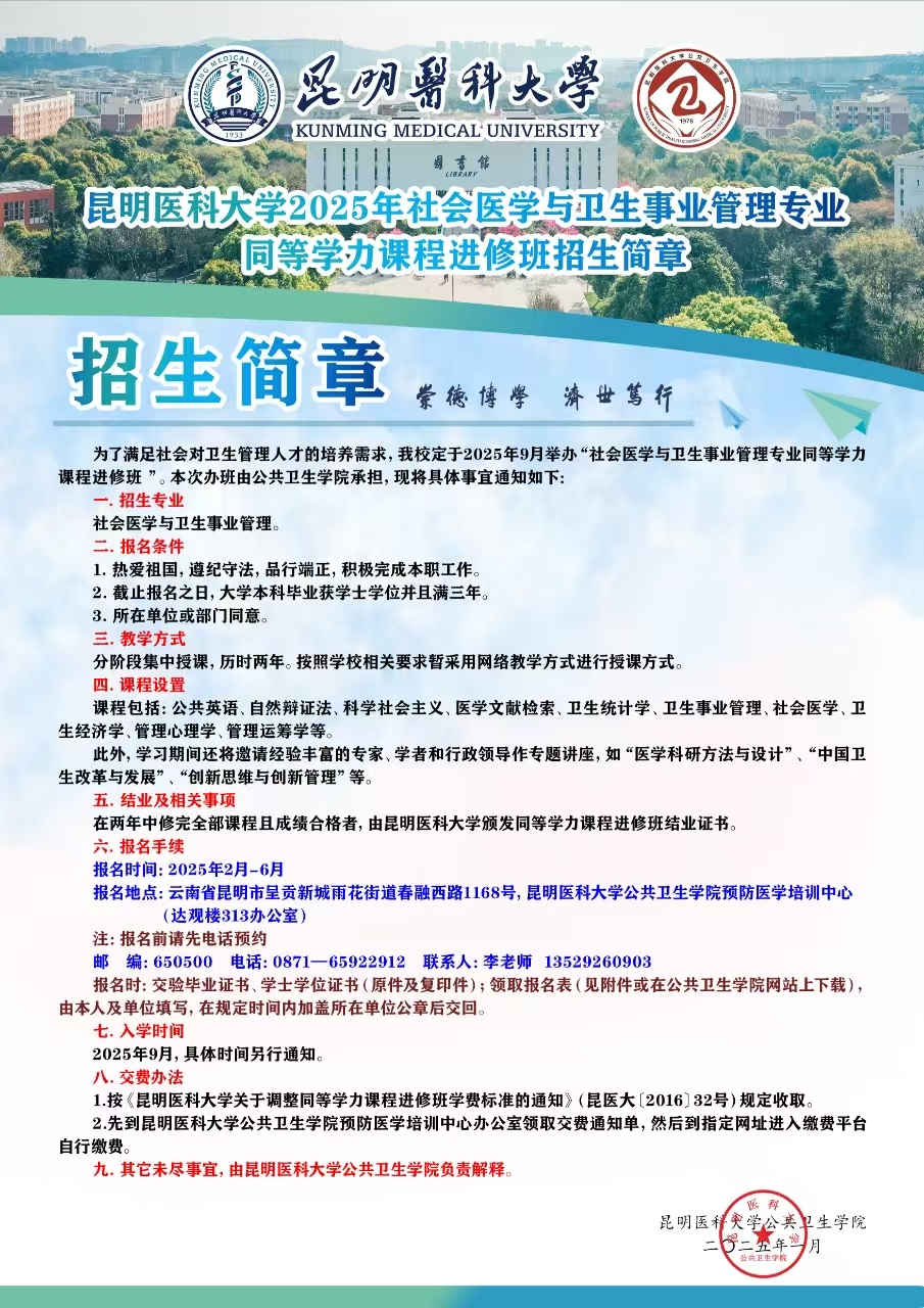 为了满足社会对卫生管理人才的培养需求,我校定于2025年9月举办 “社会医学与卫生事业管理专业同等学力课程进修班 ”。本次办班由公共卫生学院承担,现将具体事宜通知如下: