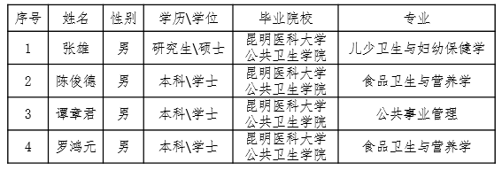 根据《伟德国际1949官网关于印发开发科研助理岗位吸纳高校毕业生就业工作方案的通知》(昆医大〔2020〕76号)文件精神和《伟德国际1949官网公共卫生学院科研助理工作人员管理办法(试行)》要求,公共卫生学院经过考察,拟聘用张雄等4名同志为学院科研助理岗位工作人员,现予以公示。