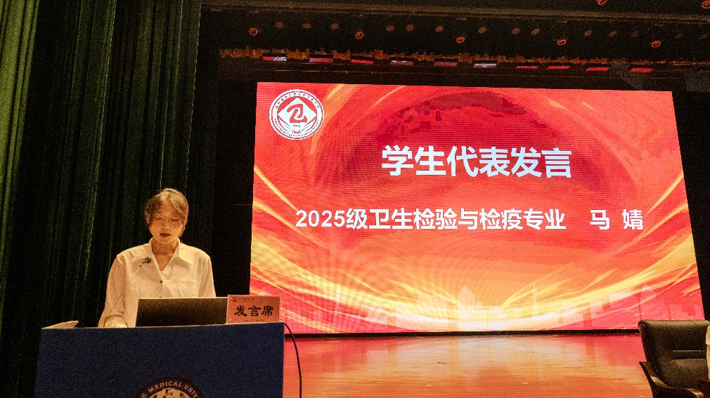 2025级卫生检验与检疫班本科新生马婧从自身经历出发,分享了初识昆医的校园印象,并回顾疫情时期“检以求真,验以求实”的专业精神如何深深烙印于心。她代表全体新生立下誓言:将始终牢记“健康所系,性命相托”的医学誓言,努力成长为有理想、有本领、有担当的新时代公卫人。