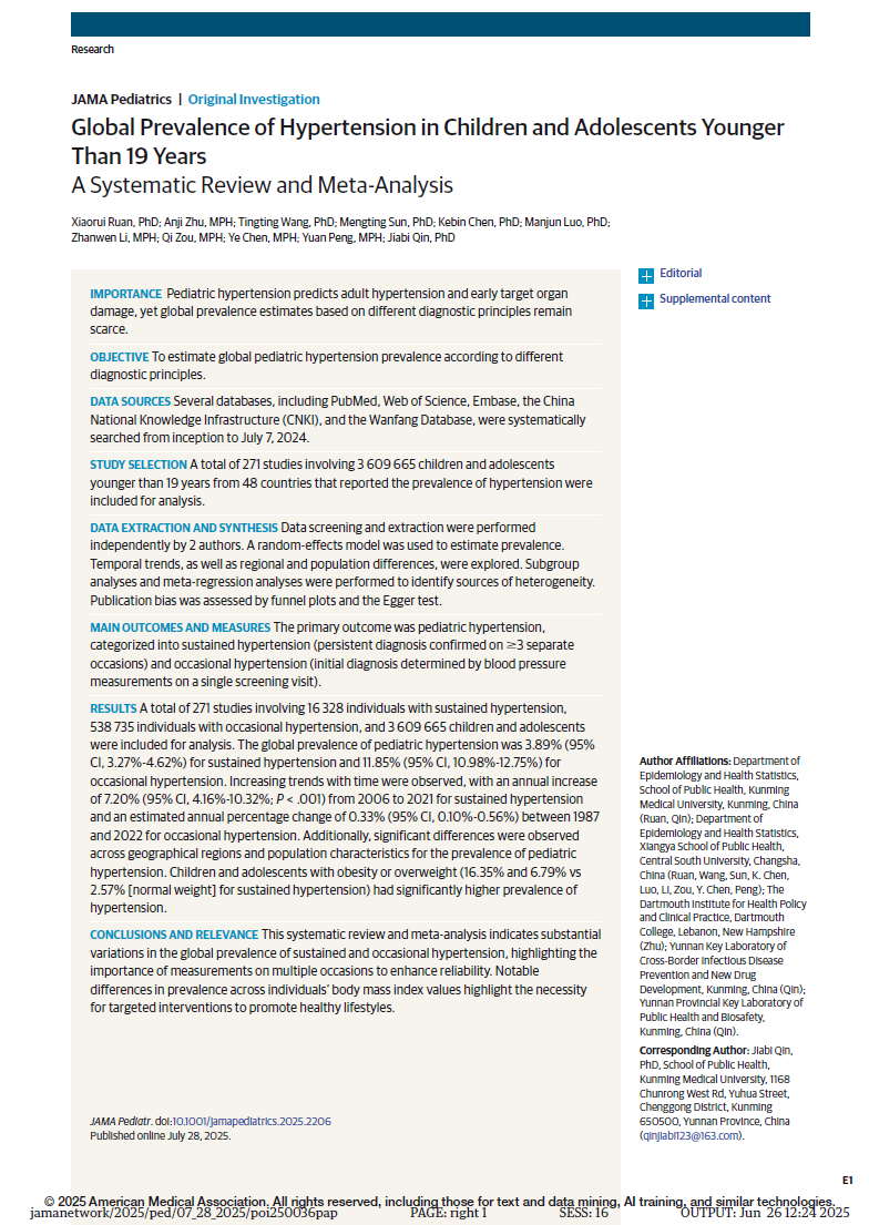 近日,伟德国际1949官网公共卫生学院秦家碧教授团队在儿科领域顶刊《JAMA Pediatrics》(中国科学院1区Top,IF=24.7,儿科领域排第1)上发表题为《Global Prevalence of Hypertension in Children and Adolescents Younger Than 19 Years》的科研论文。伟德国际1949官网公共卫生学院秦家碧教授为该文章的唯一通讯作者,其博士生阮霄睿为文章唯一第一作者。伟德国际1949官网公共卫生学院为并列第一作者单位和唯一通讯作者单位。本研究受国家自然科学基金(82473644、82404362、82073653)、省杰出青年基金、省重点研发计划等项目资助。