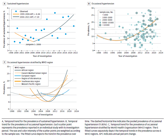 儿童青少年期持续血压偏高的个体将发展为成年高血压并较早出现靶器官损害,进一步加重心血管病负担。因此,将高血压防治窗口下移至儿童青少年人群是遏制全球高血压上升趋势和降低心血管病负担的根本之策。了解全球儿童青少年高血压患病情况及流行特征,能为防控措施制定及卫生资源配置奠定基础数据。文章首次评估不同诊断标准下全球儿童青少年高血压的流行现状、时间趋势、人群及地域分布,研究结果显示:全球19岁以下儿童青少年持续性高血压(sustained hypertension)患病率为3.89%(1级高血压:3.11%;2级高血压:0.67%),偶发性高血压(occasional hypertension)患病率为11.85%(1级偶发高血压:10.15%;2级偶发高血压:2.11%);儿童青少年高血压的流行逐年升高(左图),存在显著地域和人群差异,尤其是超重/肥胖人群高血压患病率(持续性高血压:6.79%;偶发性高血压16.35%)显著高于其他人群。这些结果提示高血压是儿童青少年人群常见疾病之一,应重视其早期防控;不同的诊断标准儿童青少年儿童高血压患病率差异大,强调标准化诊断的重要性。