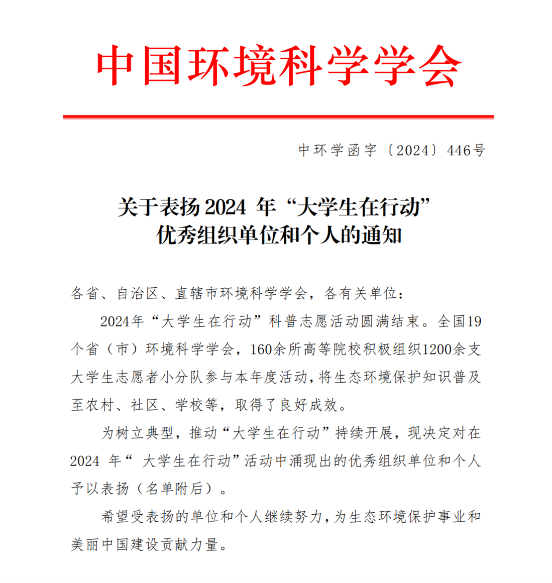 树榜样之风,扬科普之帆,中国环境科学学会发布了《关于表扬2024年“大学生在行动”优秀组织单位和个人的通知》,公共卫生学院仁心相护队荣获“优秀小分队”称号、吴林雄老师荣获“优秀指导教师”称号,伟德国际1949官网学生生态健康科普协会荣获“优秀社团”称号。