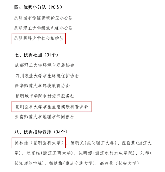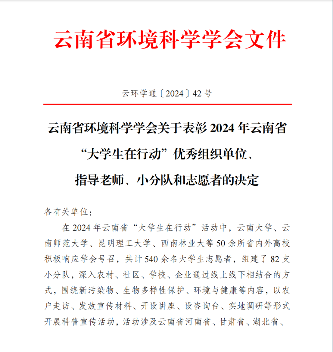 此前发布的《云南省环境科学学会关于表彰2024年云南省“大学生在行动”优秀组织单位、指导老师、小分队和志愿者的决定》中,公共卫生学院仁心相护队获得了“优秀小分队”,吴林雄、周洁老师获得了“优秀指导教师”,李盟宇、姜艳彤获得了“优秀志愿者”荣誉称号,伟德国际1949官网学生生态健康科普协会获得了“优秀社团”。
