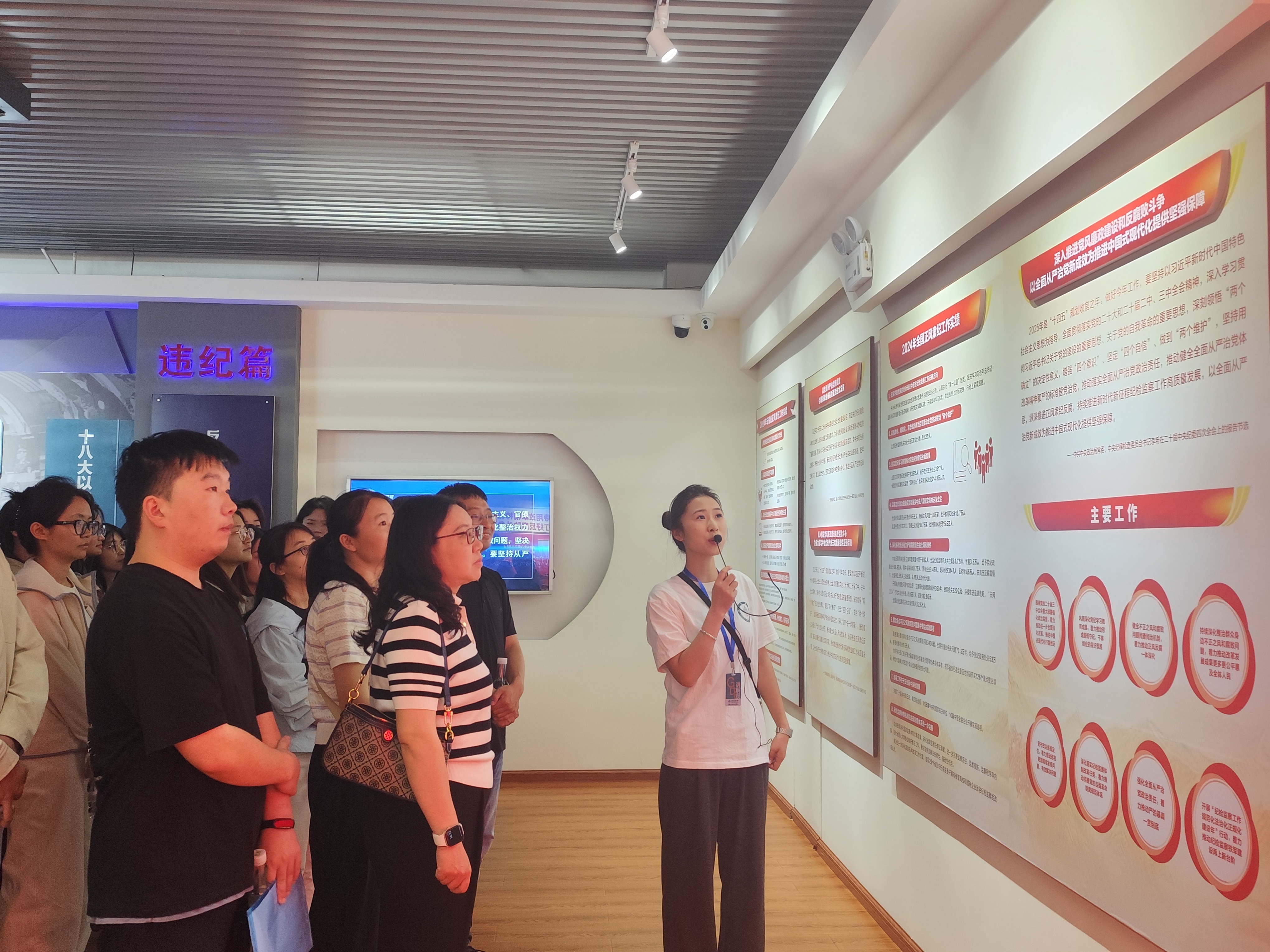 在讲解员带领下师生党员依次围绕“党纪篇”、“违纪篇”和“正纪篇”三个基地的主要组成部分展开学习。