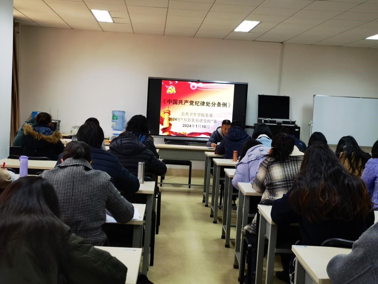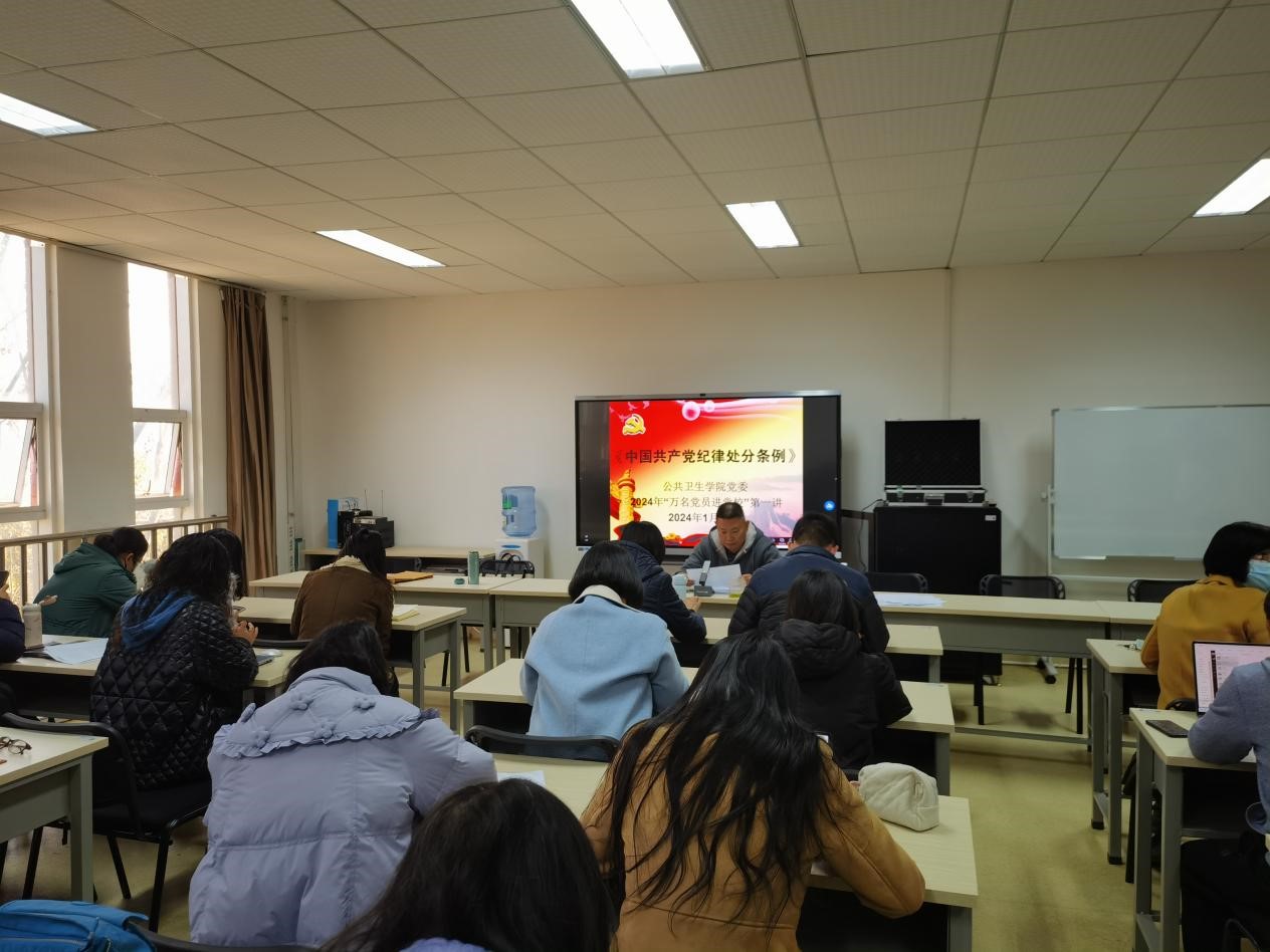 为进一步学习贯彻《中国共产党纪律处分条例》(以下简称《条例》),传达学习中国共产党第二十届中央纪律检查委员会第三次全体会议精神,落实干部教育培训要求,营造以清为美、以廉为荣的浓厚氛围,共建廉洁公卫。2024年1月10日上午在达观楼307会议室,学院2024年“万名党员进党校”第一讲由党委书记罗勇前同志为全体教职工主讲《中国共产党纪律处分条例》。
