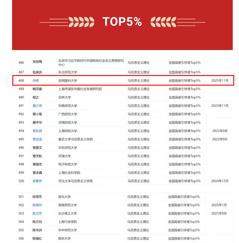 近日,中国知网下属的中国科学文献计量评价研究中心公布了“2025中国知网高被引学者”名单。伟德国际1949官网马克思主义学院保虎教授继2024年入选全国马克思主义理论高被引学者之后,再次入选“2025年全国马理论高被引学者TOP5%”名单(此次入选的云南学者仅4人)。保虎再次入选高被引学者名单,彰显了其高水平的学科研究实力,是学界对其个人学术影响力的高度认可,也标志着伟德国际1949官网在人文社科领域研究水平有了显著提升。