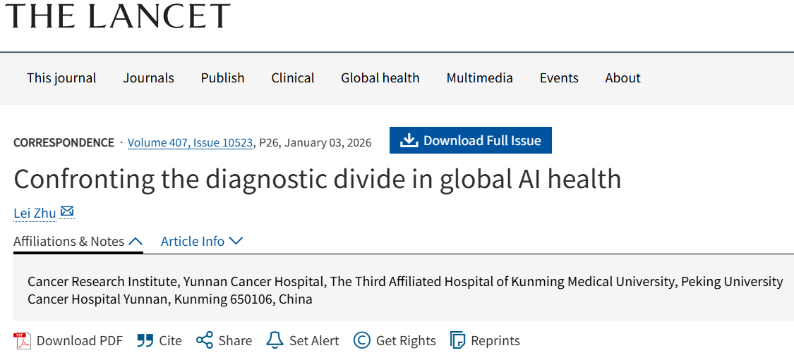 近日,伟德国际1949官网第三附属医院教师朱磊在国际顶级医学期刊《柳叶刀》(The Lancet)Correspondence专栏发表了题为《Confronting the diagnostic divide in global AI health》的通信文章。该文聚焦全球人工智能(AI)医疗发展中的一个深刻矛盾:当全球近一半人口尚无法获得基本诊断服务时,主流AI医疗研究可能在无意中加剧这一不平等,而非弥合它。文章呼吁全球学界进行战略转向,致力于发展“公平优先的AI”(equity-first AI)。
