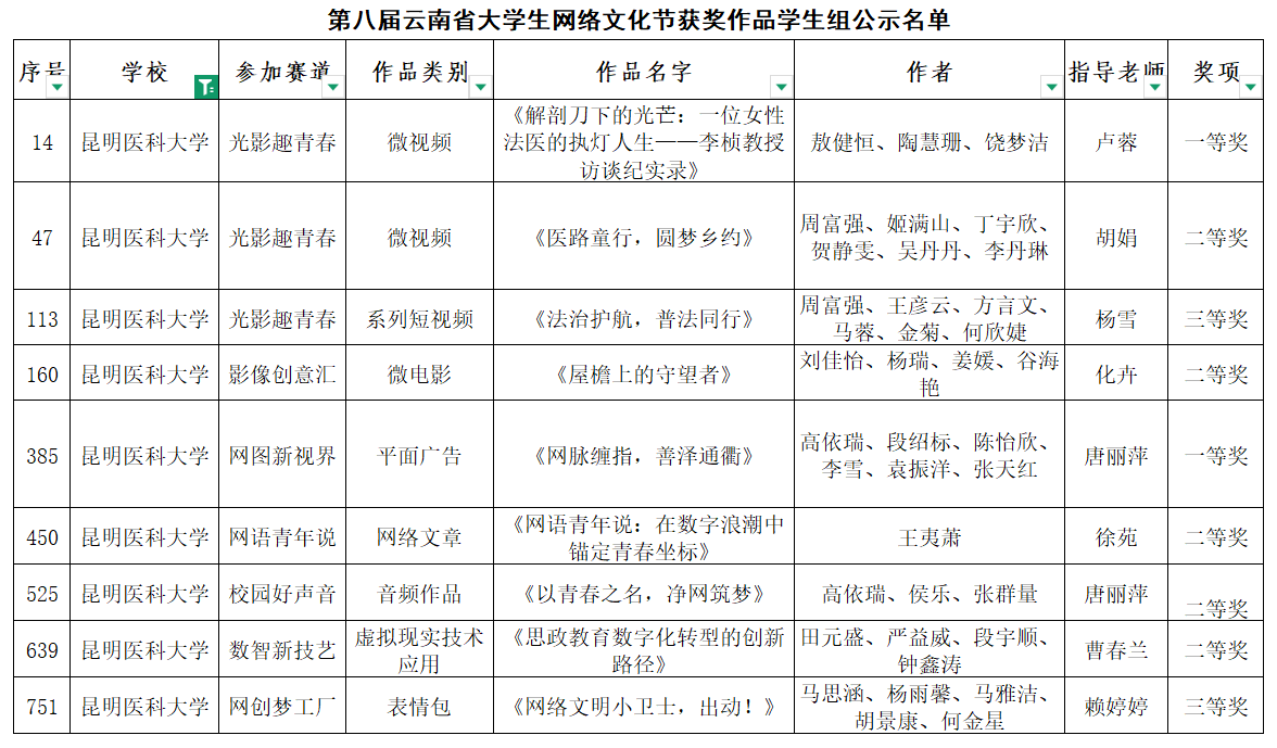 近日,省委教育工委对第八届云南省大学生网络文化节和云南省高校网络教育优秀作品推选展示活动评审结果进行了公示。伟德国际1949官网共20项作品获奖,其中,教师组作品获一等奖6项、二等奖4项、三等奖1项;学生组作品获一等奖2项、二等奖5项、三等奖2项。