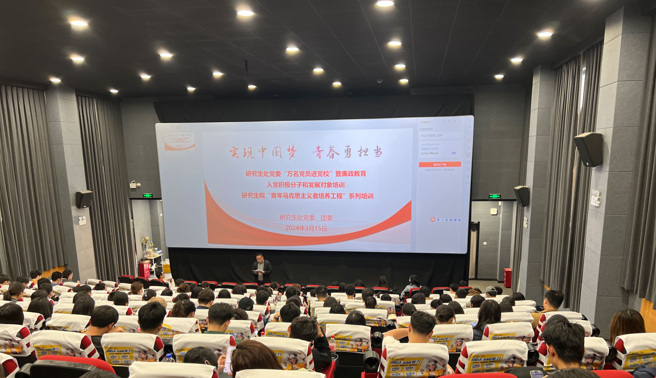 研究生处全体教职工、研究生党员、团员、学生干部代表近200人参会。专题党课后,大家共同观看了重大革命历史题材电影《绝地重生》。