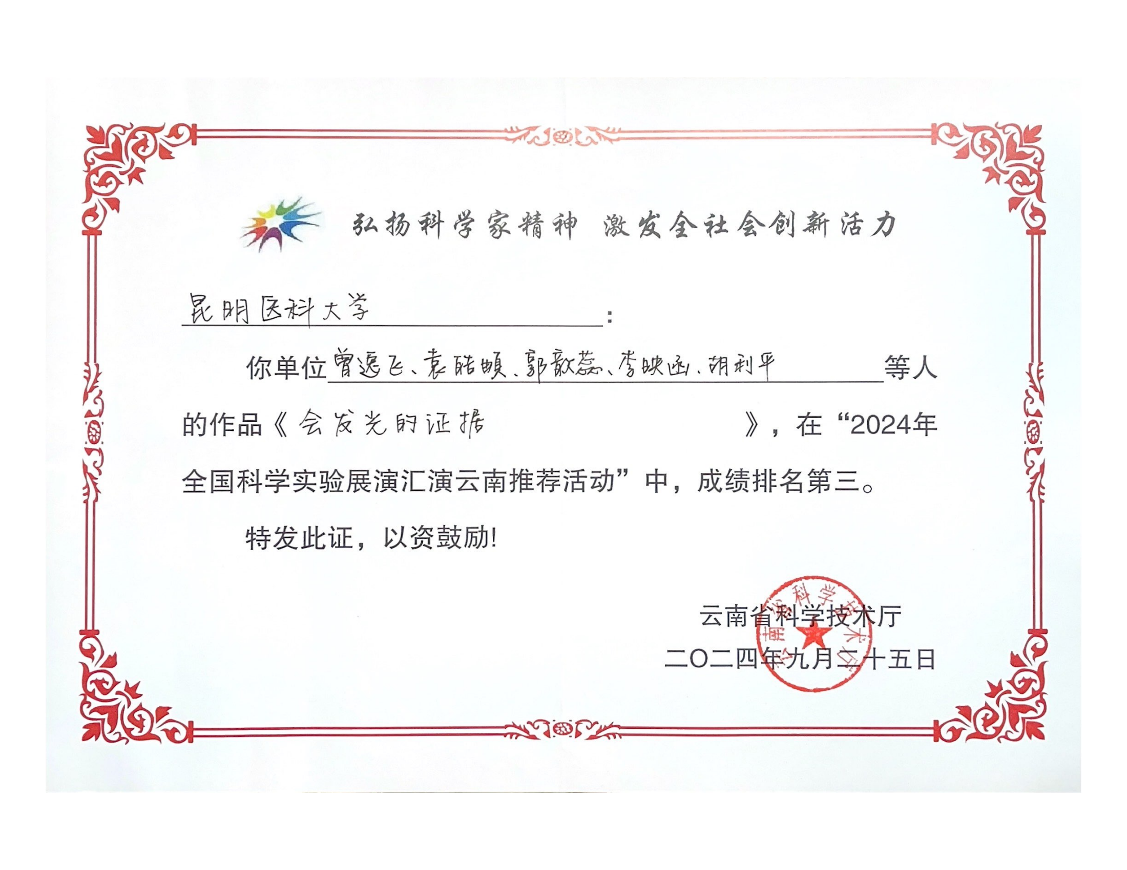 此次展演汇演以“弘扬科学家精神激发全社会创新活力”为主题,旨在全社会传播科学知识,展示科学原理,讲述科学故事,弘扬科学家精神,营造尊重科学、 崇尚创新的社会环境。本次活动云南省共征集到科学实验作品102个,经过第一阶段激烈角逐,包括我校法医学院在内的19个作品进入第二阶段展演汇演。评委从实验内容、演示效果、整体形象、提问等方面对入围参赛队的现场表现进行综合评定,最终我校法医学院作品《会发光的证据》荣获省级三等奖。