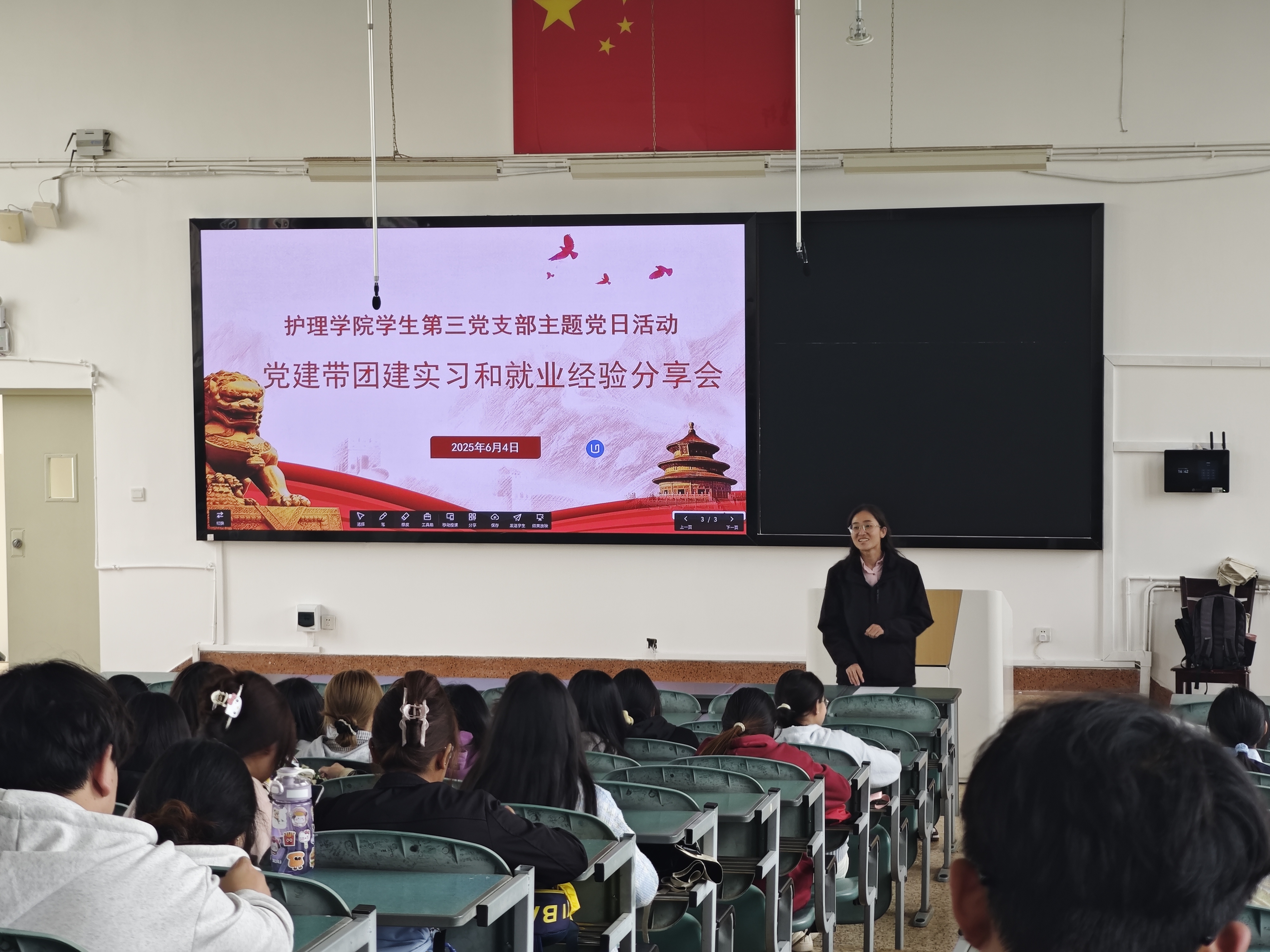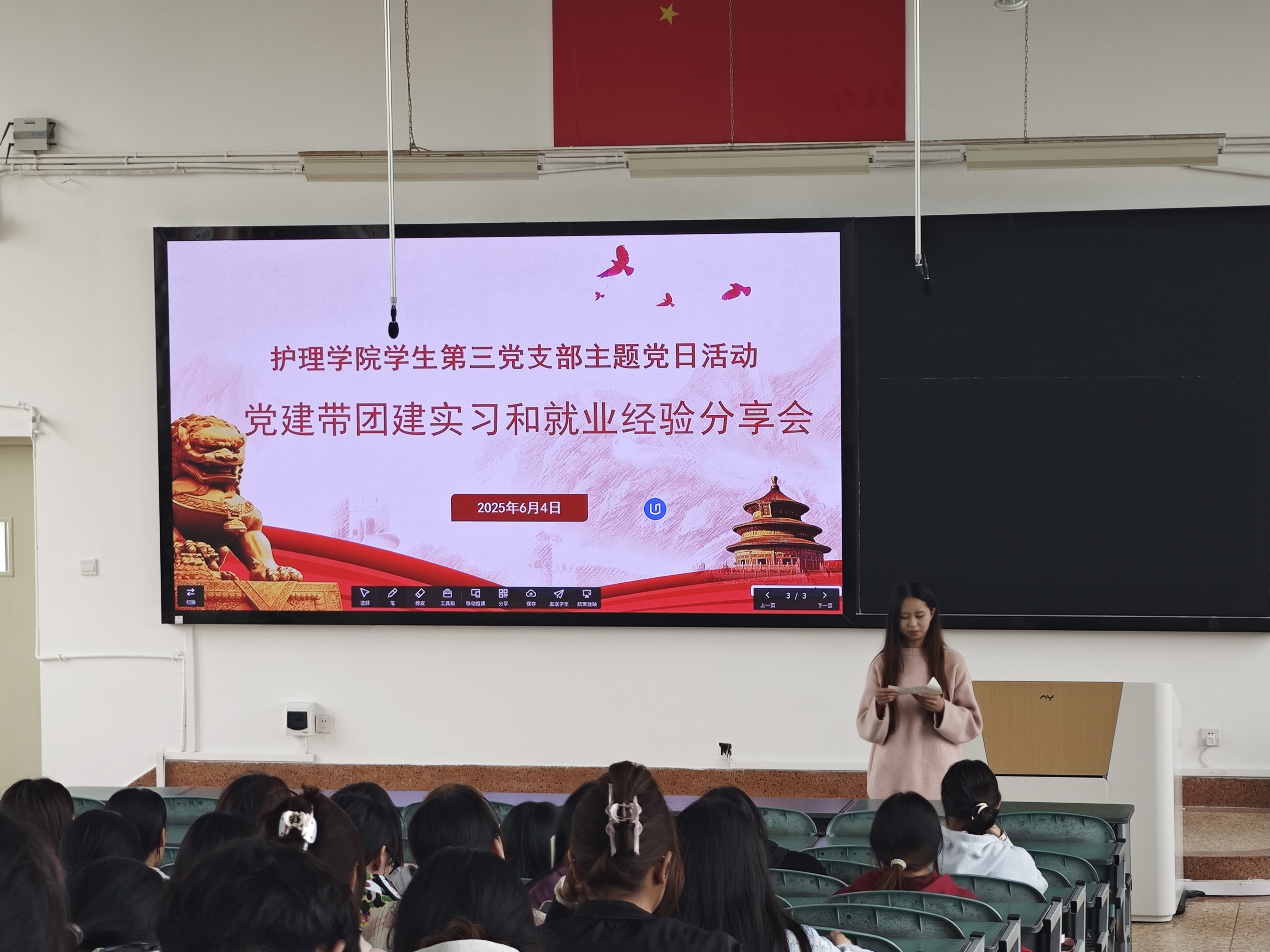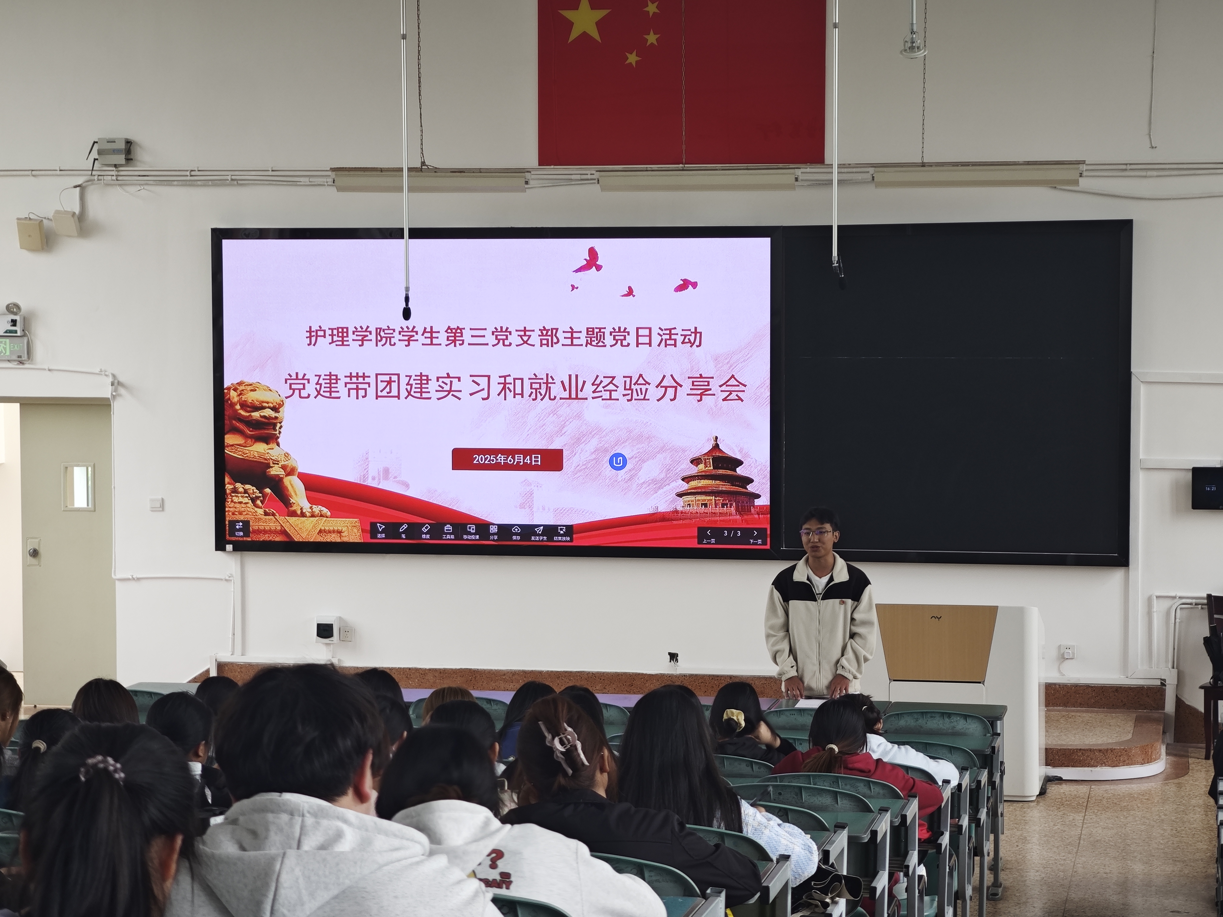 2025年6月4日,为帮助在校生更好地适应临床实习与就业,护理学院学生第三党支部开展了“党建带团建”实习和就业经验分享会,邀请了两位毕业生党员代表文希、字梦杰,面向2023级护理学三大班、2023级助产班全体同学进行经验分享。