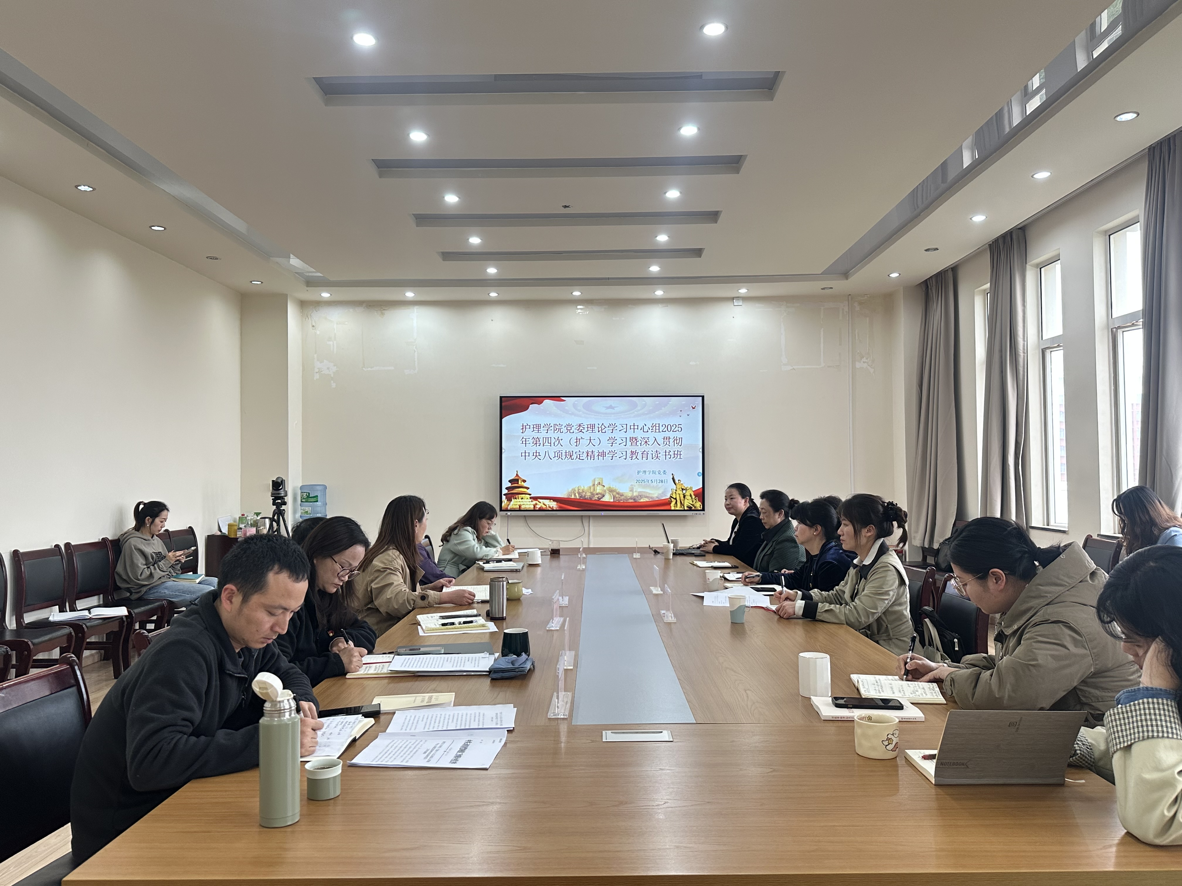 2025年5月28日,护理学院党委理论学习中心组第四次(扩大)学习暨开展深入贯彻中央八项规定精神学习教育读书班在呈贡校区开展,学院党委书记杨国华主持会议,伟德国际1949官网海源学院党委副书记杨莉萍、宣传部副部长王笑列席。