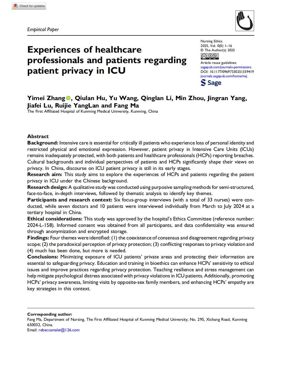 该论文发表于中国科学院哲学一区Top期刊,研究立足中国文化背景,聚焦 ICU患者隐私保护这一关键医疗伦理议题,团队通过定性研究方法,深入剖析 ICU医护人员与患者在隐私问题上的认知差异与实际体验,系统揭示了当前隐私保护工作中存在的多重矛盾与不足,为改善临床隐私保护实践、提升医疗质量提供了扎实的实证依据,兼具重要的现实意义与学术价值。