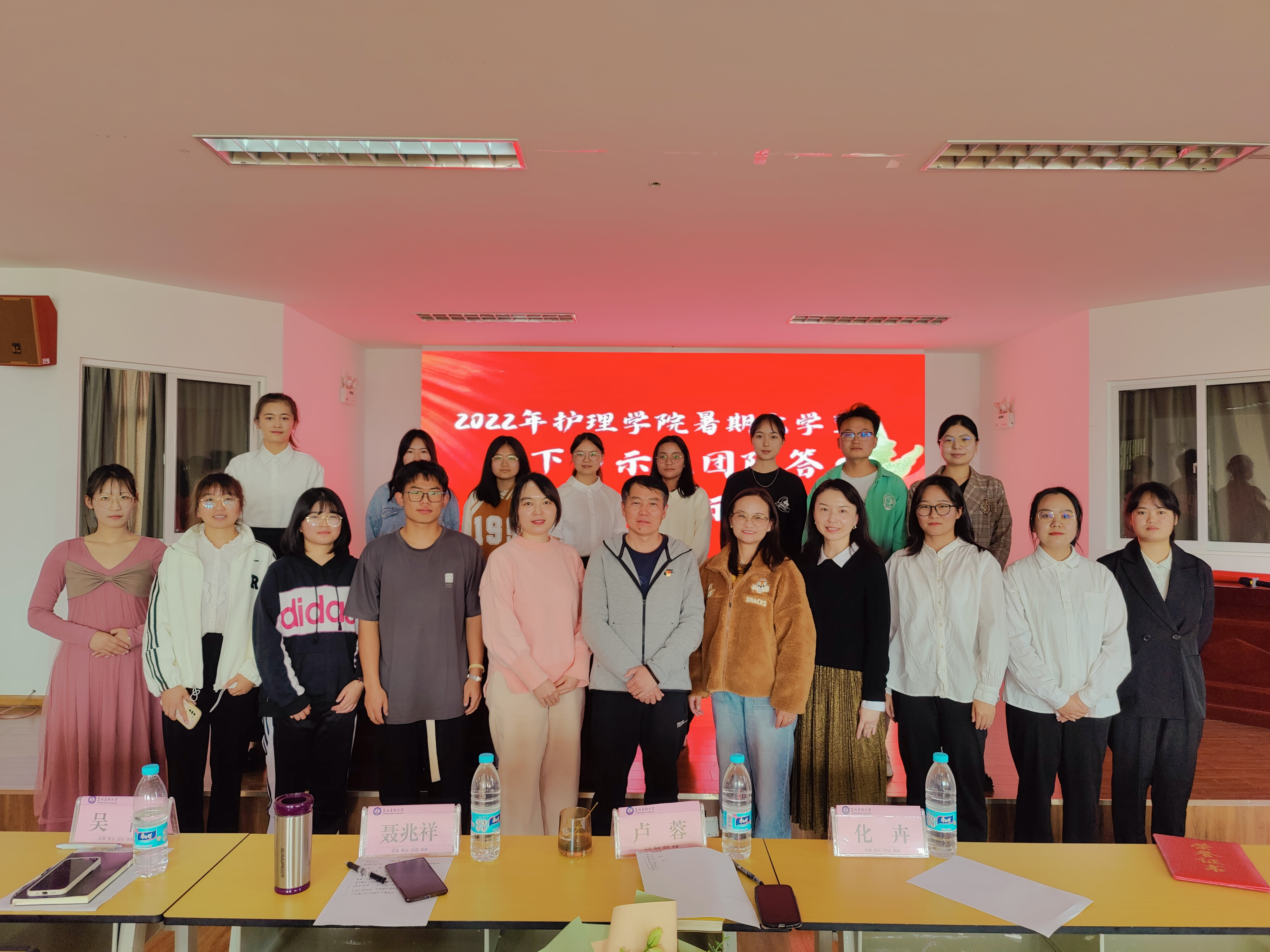 2022年10月21日,伟德国际1949官网护理学院2022年暑期大学生“三下乡”示范团队答辩暨成果展示活动在护理学楼501报告厅举行,共10支院级示范团队参加本次活动。本次活动由护理学院团委主办,护理学院党委副书记聂兆祥、学院党政办主任、学生第二党支部书记吴青、学生工作办公室主任卢蓉、团委书记化卉、学科科研及研究生管理办公室教师文信到场担任评委,各立项团队全体成员、院团学骨干代表参与活动。