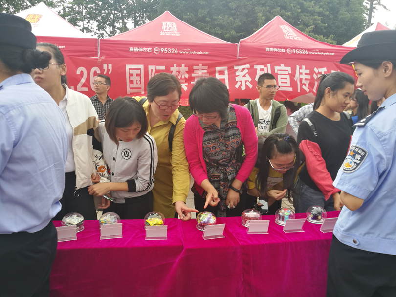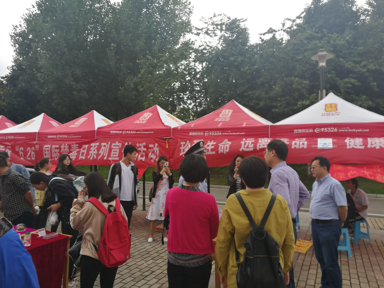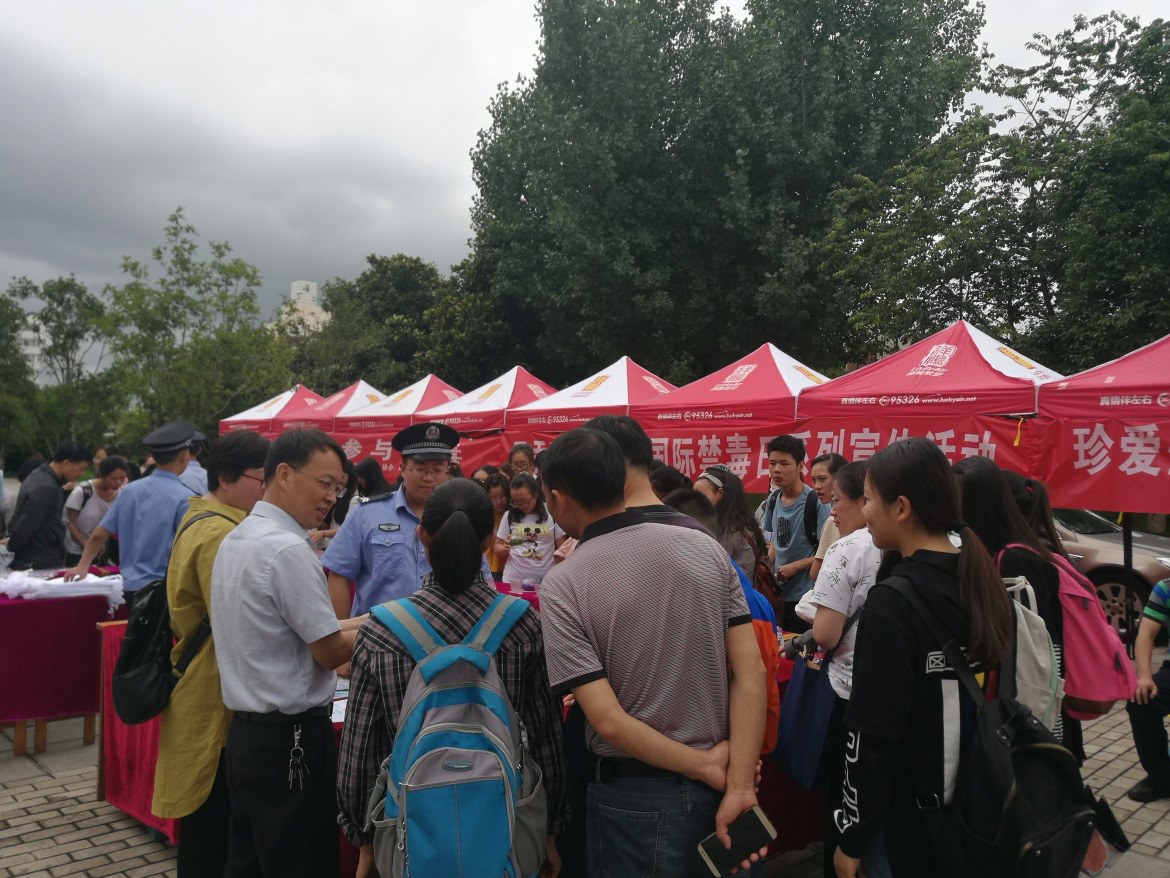 在第三十一个国际禁毒日来临之际,6月25日,伟德国际1949官网联合昆明市公安局呈贡分局禁毒大队,在呈贡校区开展了以“健康人生,绿色无毒”为主题的系列禁毒宣传活动。校党委副书记、校长李松,校党委委员、副校长李铭,校长办公室、学生工作处、公共卫生学院负责人等参加了活动。