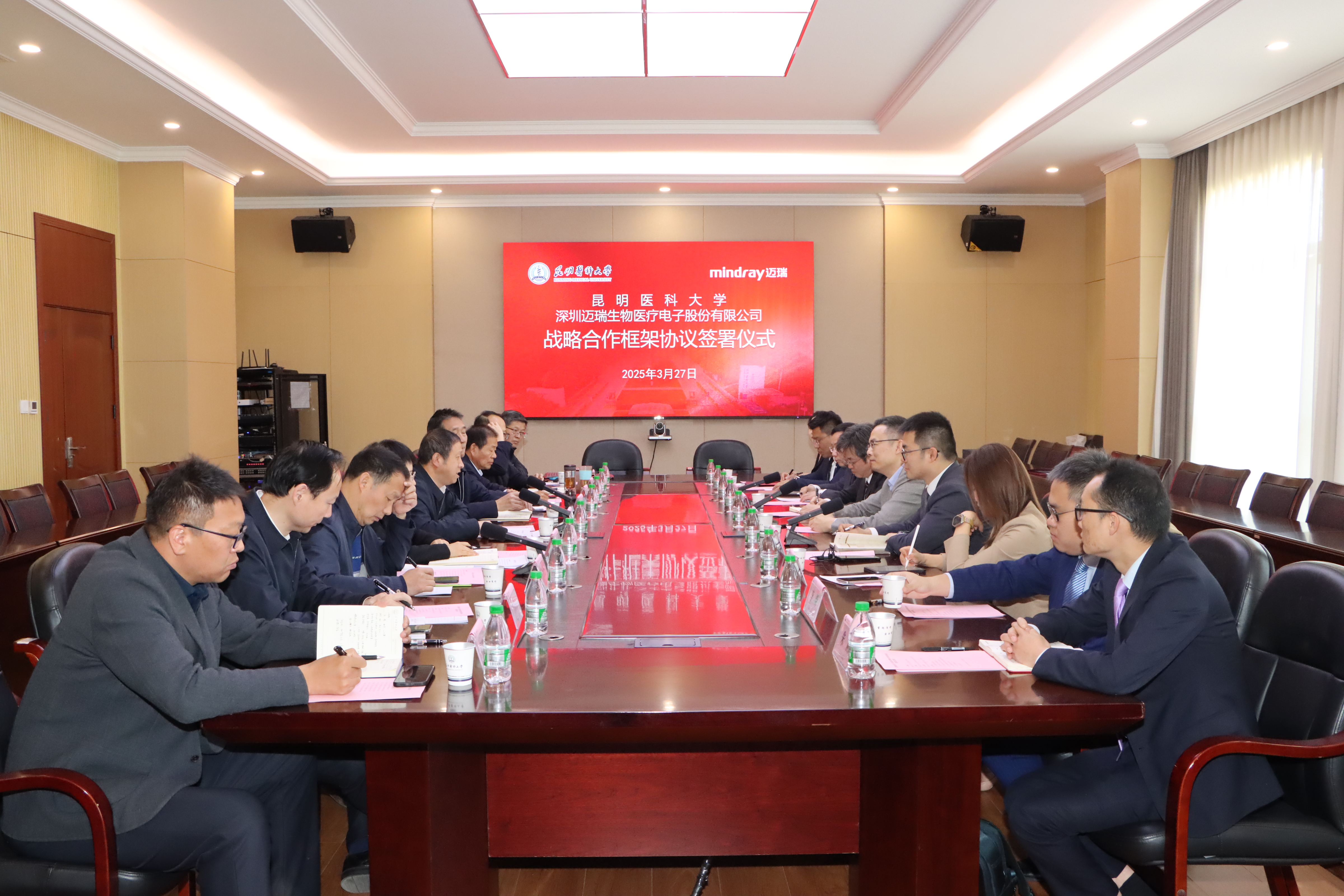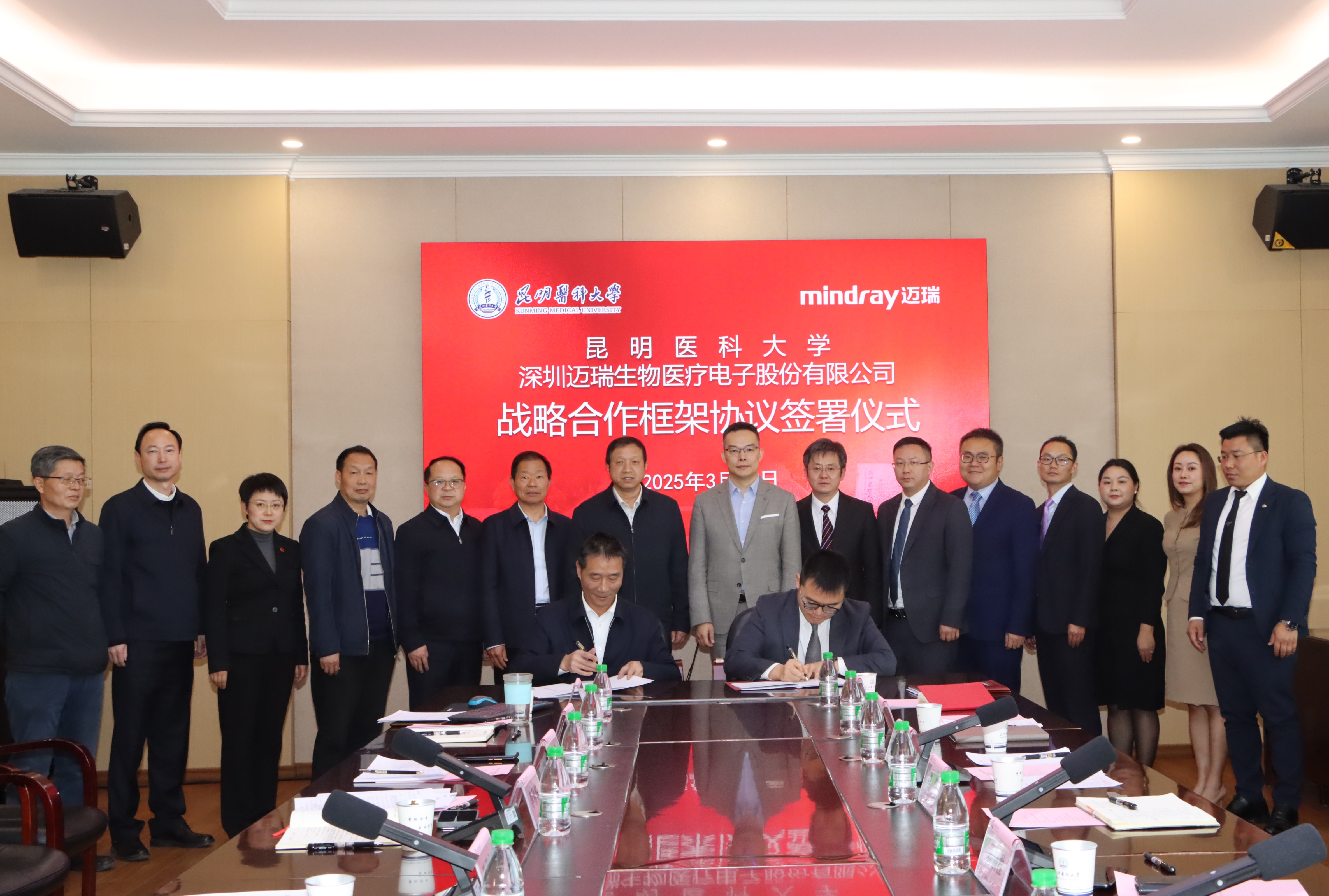 3月27日上午,伟德国际1949官网与深圳迈瑞生物医疗电子股份有限公司(以下简称迈瑞医疗)战略合作框架协议签署仪式在伟德国际1949官网呈贡校区举行。伟德国际1949官网校长夏雪山,党委常委、副校长李利华;迈瑞医疗中国区总经理黄鹏程、昆明分公司总经理辜锐、中国区公立客户市场经理曾晖出席签约仪式。学校和迈瑞医疗昆明分公司相关部门负责人参加签约仪式。李利华主持签署仪式。