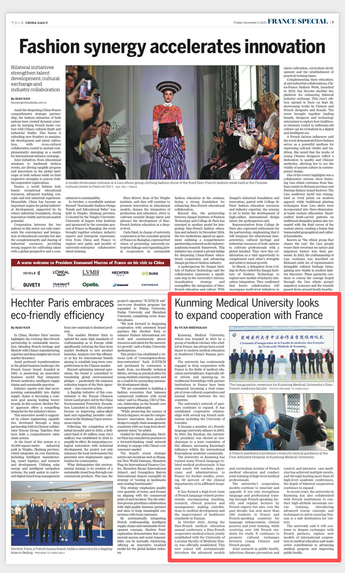 应国家主席习近平邀请,法国总统马克龙于12月3日至5日对中国进行国事访问。《中国日报》出版“法国总统访华-暨中法友好特刊”报道我校中法合作医学教育成果。