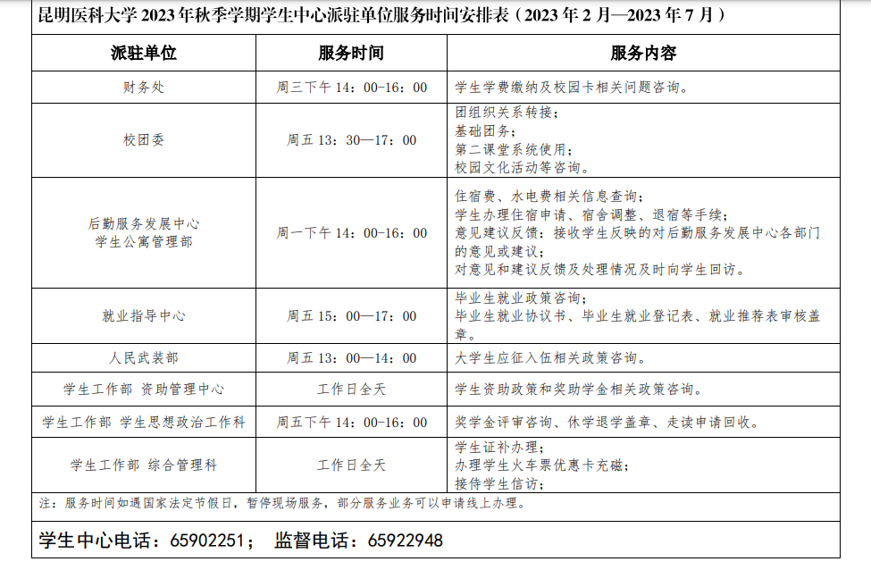 学生中心开放时间、派驻单位服务时间及服务事项,每个学期发布一次,如有变化将另行通知。