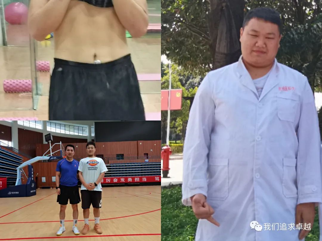 最高减重个人,原始最重体重:130公斤,本学期减重49公斤,减重百分比:37.7% 因为基础体重过大,我设计的是先加强身体力量训练,等关节充分适应之后,再循序渐进逐步提高机能代谢的力量+有氧的训练方式。 但尽管如此,对于体重基数过大,缺乏系统锻炼的你们来说,从最初的不适,到克服身体的难受,接着是靠毅力忍受,到慢慢接受规律的训练,一直到最后,很多同学已经体会到了享受运动的乐趣! 我知道:从“难受—忍受—接受—享受”。看似简单的八个字,但对于胖了十多年的你们来说,不光是身体,也是内心精神,脱胎换骨的蜕变! 但你们坚持了下来,努力做到了!为你们点赞,也为你们骄傲…本学期减重最多的两位同学,我左边的同学减重49公斤+,右边同学40公斤- 希望你们在未来的日子,继续保持锻炼的习惯,相信你们一定会越来越棒! 记住田老师的话:“你们每一个人都是充满了潜力,无论是生活、学习、还是颜值。好好打造优秀的自己,不负自己的期望!”