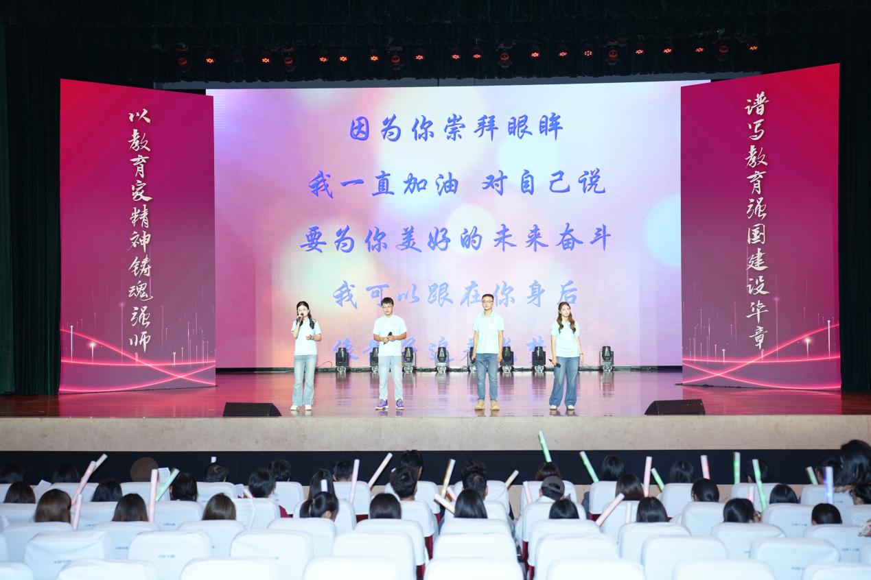 学生代表深情献唱《追光者》,并向教师代表敬献鲜花,用歌声与鲜花表达对老师的感恩与祝福。