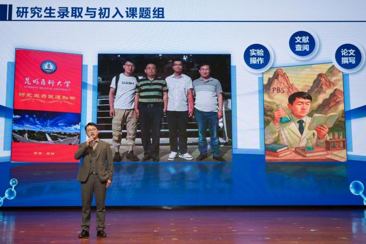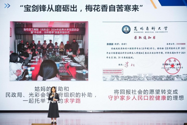 优秀师生代表专题宣讲环节,口腔医学院本科生袁德颖以《向阳而生,砥砺奋进——在青春的赛道上奋力奔跑》为题,分享了自己在逆境中锤炼成才的故事,展现了昆医学子坚韧不拔的精神风貌。