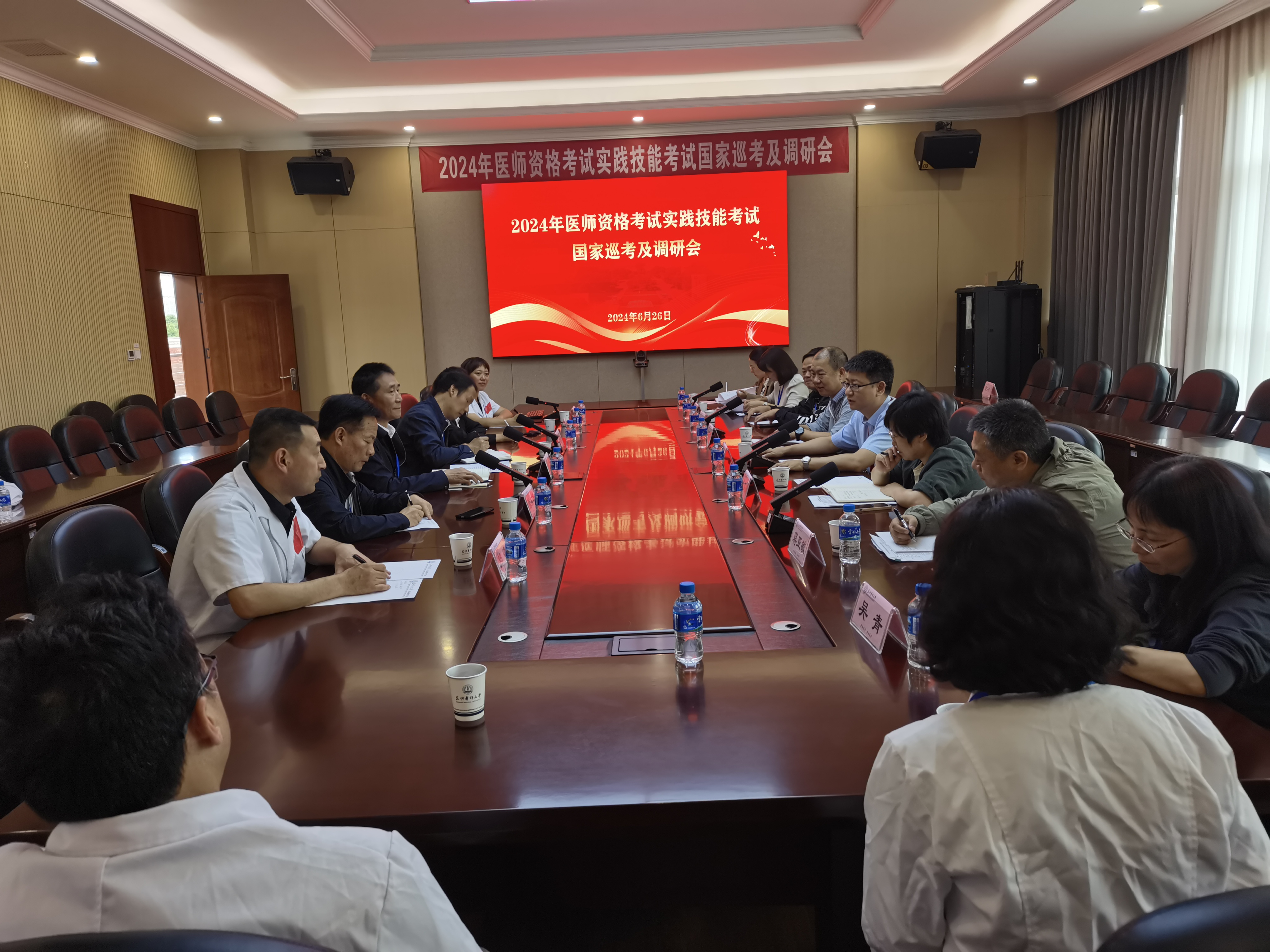 2024年6月26日,国家卫生健康委医政司医疗机构处处长胡瑞荣,国家医学考试中心发展研究部处长温吉元、考务管理部主任科员张文娟等国家巡考调研工作组,云南省卫生健康委医政处处长杨方,省卫生健康人才交流中心主任王瑾、医考办主任蒋亚敏等云南省考区巡考调研工作组,昆明市卫生人才中心主任吴青、副主任段芮等昆明考点专家组一行到伟德国际1949官网国家医师资格考试实践技能考试基地开展巡考及调研工作。学校党委常委、副校长李利华,教务处处长王金德、副处长陈有华,临床技能中心负责人及考务人员代表、考官代表等全程参加了巡考及座谈会。