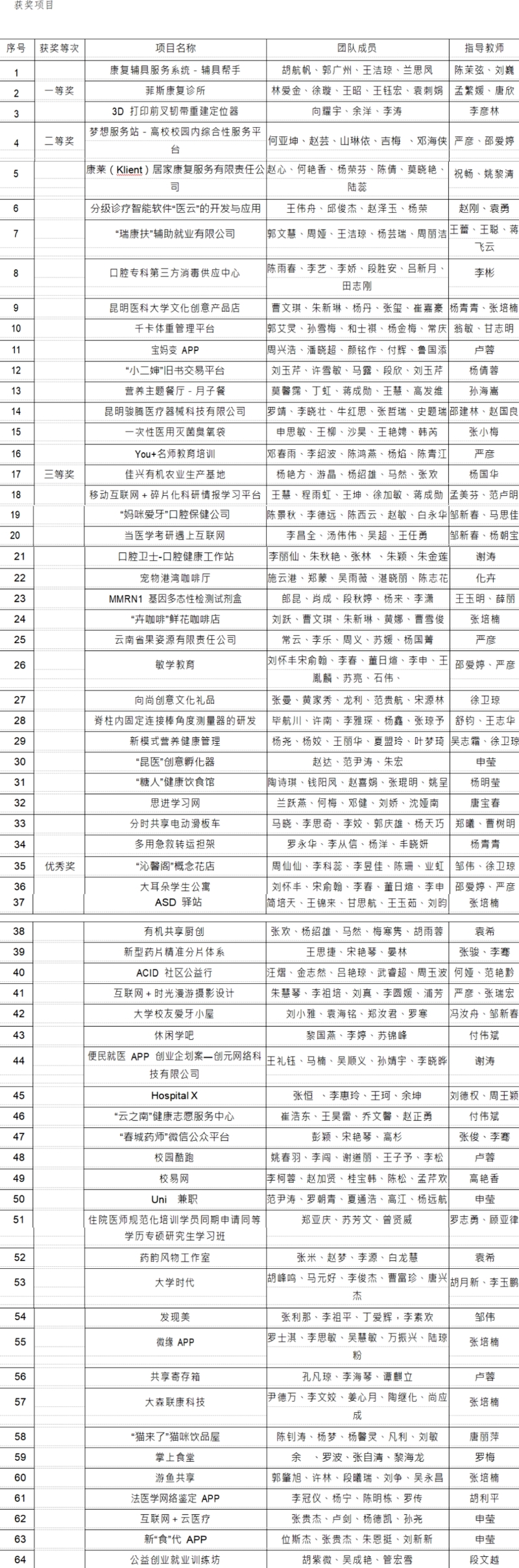 2.本届创业大赛,将继续对优秀创业项目和优秀组织奖单位予以表彰和奖励。对获得校级决赛三等奖以上的项目团队, 将给予以下奖励:一等奖2000元,二等奖1500元,三等奖1000 元。获奖的优秀创业项目经评委审核符合市场需求,具有可行 性和落地孵化的项目,可申请入驻“云科昆医大众创空间”, 并给予相应扶持。对代表学校参加全国和云南省创新创业大赛 并获得奖项的项目团队,按照《伟德国际1949官网教育教学工作成果奖励办法(试行)》规定给予相应奖励。