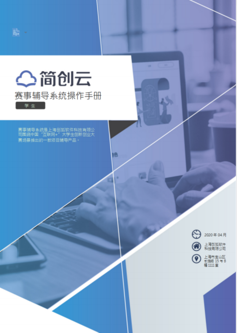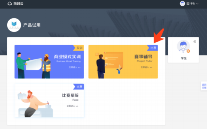 赛事辅导系统搭载于我司推出的课训赛一体化创新创业教育云平台「简创云」 之上,学生于简创云平台( www.jc-cloud.com )注册登录并至自己的学校 后,在个人主页中即可进入赛事辅导系统并提交项目参与赛事辅导活动,详细操作流程请参见本操作手册的后续部分。