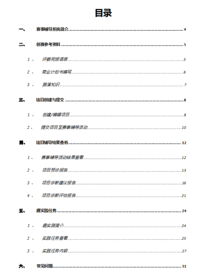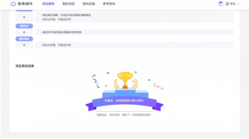 赛事辅导系统是我司(上海创狐软件科技有限公司)围绕中国“互联网+”大 学生创新创业大赛场景推出的一款项目辅导产品。赛事辅导系统能够为高校提 供线上线下相结合的“互联网+“大赛一站式精益辅导,以项目预诊助力高校快速筛选潜力项目,以项目诊断帮助高校培育项目并提升整体项目质量,以趣实践功能为学生团队提供项目改进指引,在此过程中系统还可输出预诊、诊断报告,为高校的赛事辅导工作留存关键数据。