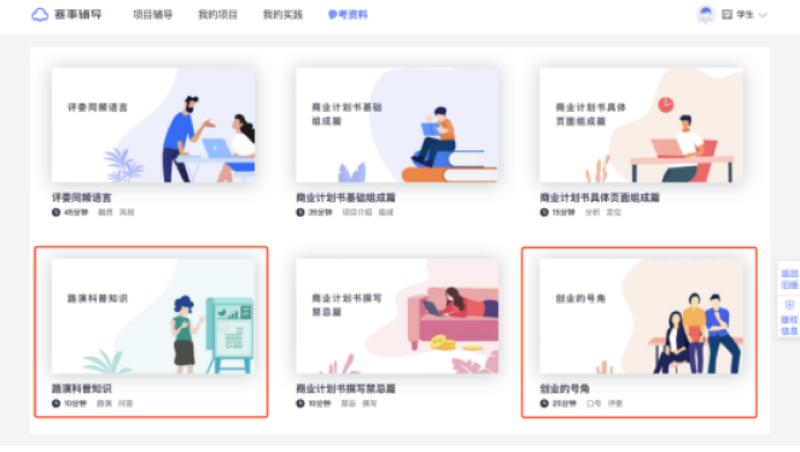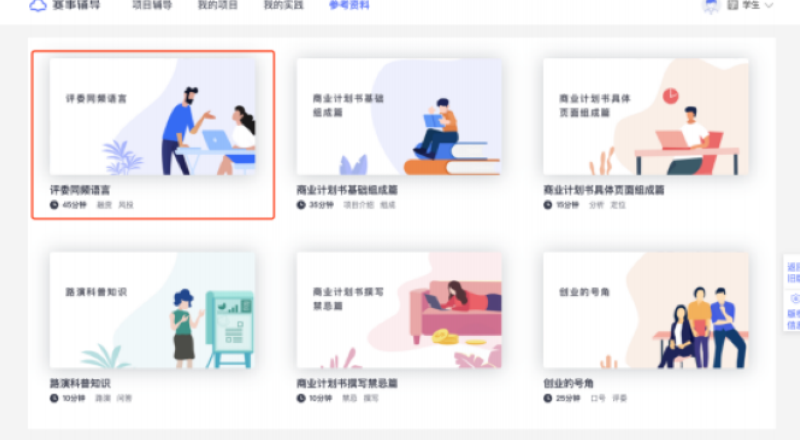 赛事辅导系统中为您提供了一些由我司合作的创业导师撰写的参考资料,您可以从中获得一些与创新创业大赛相关的基础知识,登录简创云平台(www.jc- cloud.com )并进入赛事辅导系统后,在 「参考资料」 菜单下即可查看这些资料,后续将具体进行介绍。