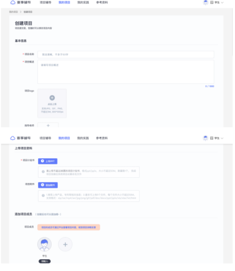 被添加的项目成员则可在自己的账号中看到该项目并查看相关的项目辅导记录,但无法对项目内容进行编辑或将项目提交至赛事辅导活动中。