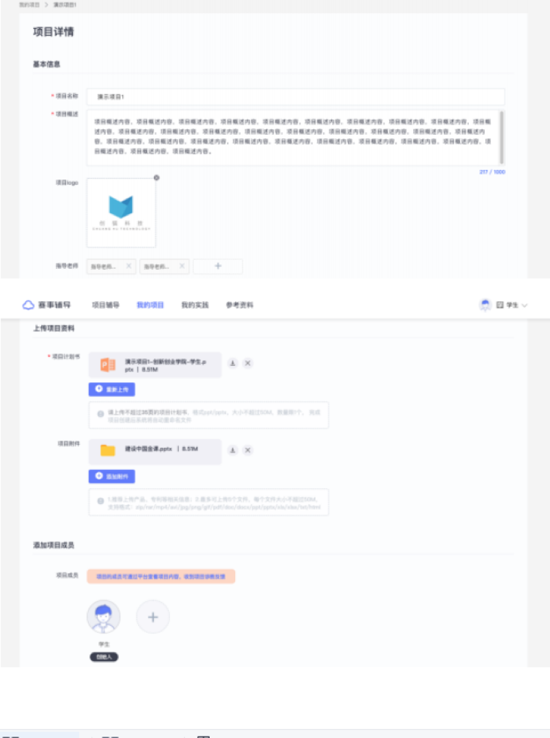 在项目详情页中,如您是项目创建人,则您可以查看和编辑当前项目的基本信息、下载和重新上传项目资料、添加和移除项目成员。新添加的项目成员可查看项目参与所有赛事辅导活动的历史记录,被移除的成员则无法再看到当前项目且无法查看该项目参与任何赛事辅导活动的历史记录。