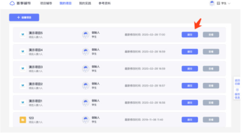 登录简创云平台( www.jc-cloud.com )并进入赛事辅导系统后,您可以在「我的项目」 菜单下的项目列表中点击 「提交」 按钮或在项目详情页中点击「提交」 按钮将相应的项目提交至对应的赛事辅导活动中。