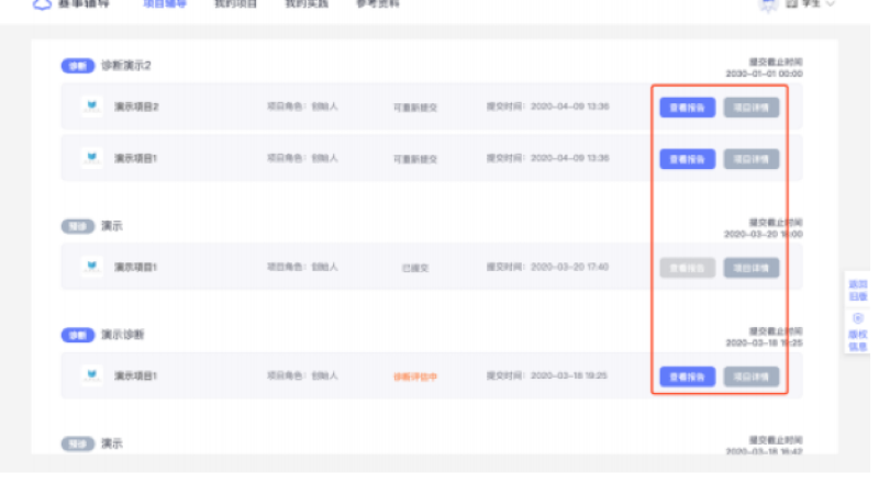 点击具体项目处的「项目详情」 按钮即可查看当时提交至相应赛事辅导活动的项目版本;