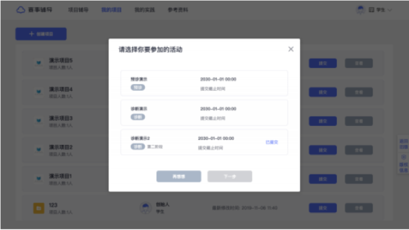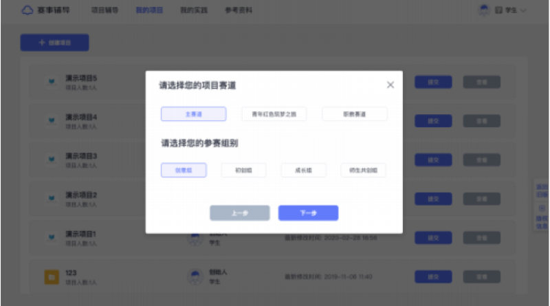 提交项目至诊断即参与相应的诊断活动,提交项目时还需选择项目计划参加哪个赛道及组别的比赛 ;