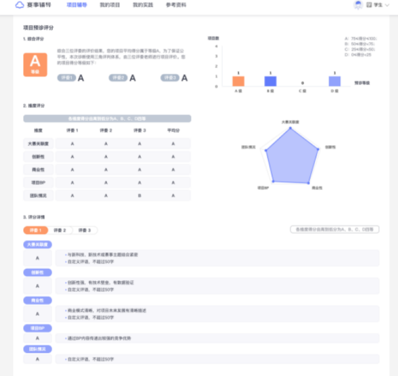 「评分详情」中会显示各个评委在各个维度下为当前项目给出的评分等级及相应的评语,这一部分是为了明确详细的预诊数据以便后续项目改进时进行参考。